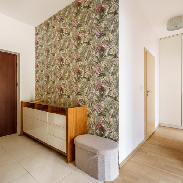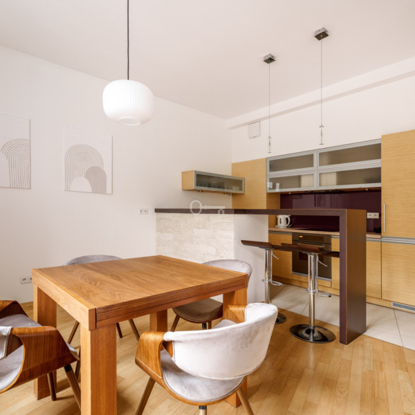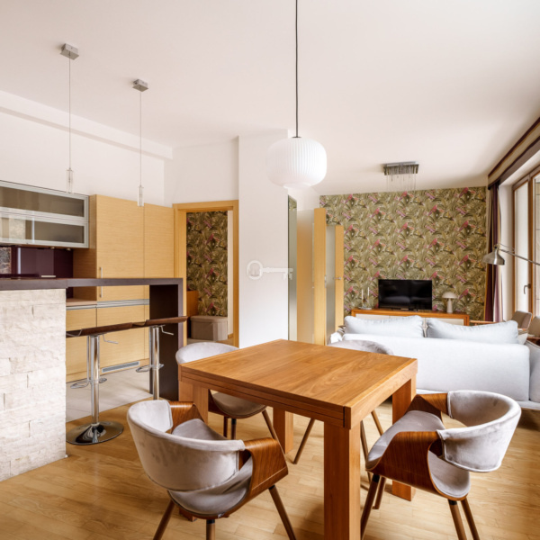 Apartament składa się z przestronnego salonu z wyjściem na taras o powierzchni 10 m2. Kuchnia otwarta na salon, w pełni umeblowana i wyposażona. Przestronna łazienka posiadająca wannę z aneksem prysznicowym. Duża, jasna sypialnia (loże małżeńskie, widok na park); szafa wnękowa. Apartament posiada także osobna garderobę. Wnętrze zaprojektowane i zaaranżowane przez architekta przy użyciu najwyższej klasy materiałów.
