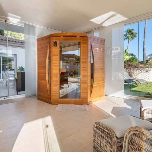 Właściciel dokonał kilku przemyślanych modernizacji, w tym sauny na podczerwień, idealnej do regeneracji mięśni i stawów, oraz przeniesienia pralki do łazienki, aby stworzyć dodatkowe miejsce do przechowywania i miejsce do pracy w kuchni.