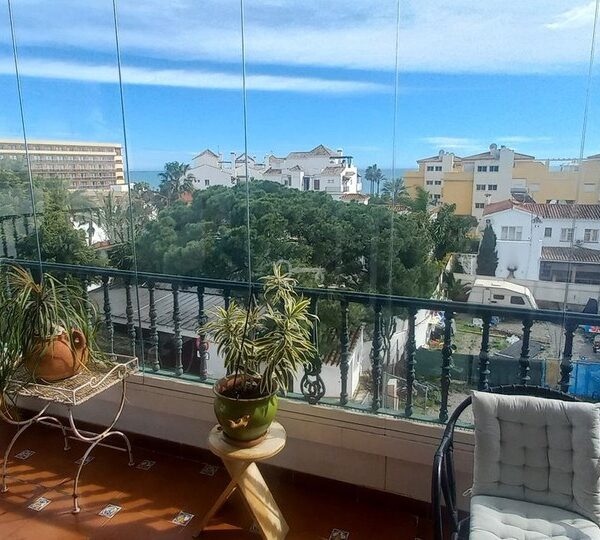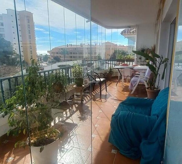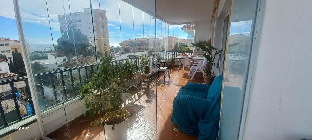 Here we can definitely say Location, Location. Fantastic opportunity to buy an apartment so close to the Beach in La Cala de Mijas. Here we have a good size two bedroom, 2 bathroom apartment, large sitting room with fireplace, fully fitted kitchen and nice hall area. The sitting room leads out to a large terrace with glass curtains and fantastic panoramic view of the surrounding area and the sea. Two mins walk and you are on the beach and board walk.