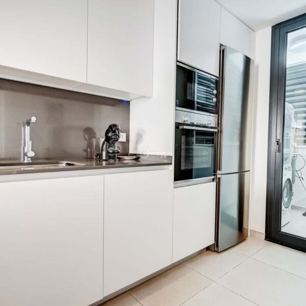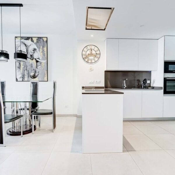 Inside, the apartment features a bright open-plan layout with a modern kitchen flowing directly into the lounge and dining area. The kitchen also benefits from a separate utility room. There are three bedrooms and two bathrooms, including a master bedroom with en-suite bathroom. Both the living room and master bedroom have direct access to the terrace, allowing plenty of natural light and seamless indoor-outdoor living.
