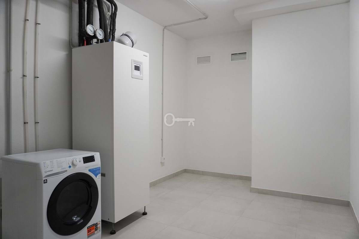 The apartment features a bright and spacious living area seamlessly connected to the open-plan kitchen, which is designed in an elegant minimalist style and fitted with integrated appliances. Large windows flood the interior with natural light, creating a warm and welcoming atmosphere throughout.