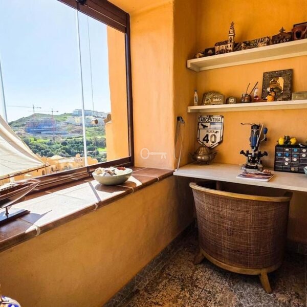 The apartment features three bedrooms and two bathrooms, including a refurbished kitchen and updated bathroom finishes that add a modern touch to the interior. The living and dining area opens directly onto a large private terrace, where sea views form a natural backdrop to daily life. A central section of the terrace has been enclosed with glass curtains, creating a bright extension of the living room that can be enjoyed in all seasons while still allowing flexibility to open the space fully.