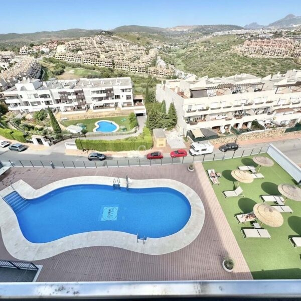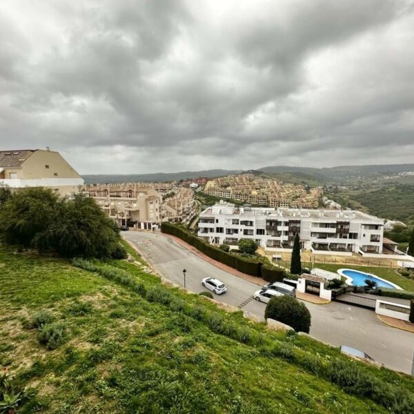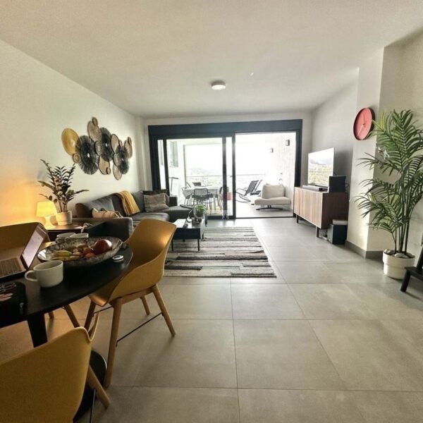 The property features two spacious bedrooms and two contemporary bathrooms, designed for comfortable year-round living or as a stylish holiday home in southern Spain. The bright and airy living room opens onto a large terrace with spectacular open views over Duquesa Golf Course, creating a peaceful setting that feels like a fourth-floor panoramic outlook.