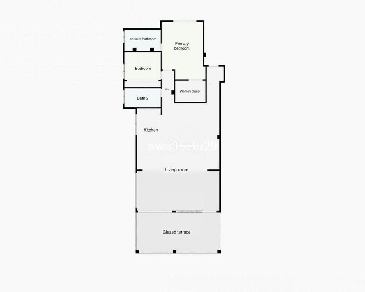 Large windows open onto a glass-enclosed terrace with sliding glass curtains,