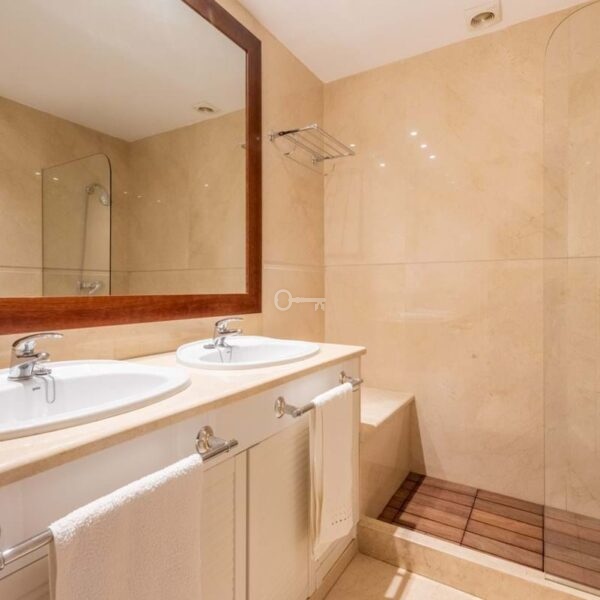 The apartment features two spacious bedrooms, both with ample storage and en-suite bathrooms. The kitchen is fully equipped with everything you need to prepare your favorite meals.