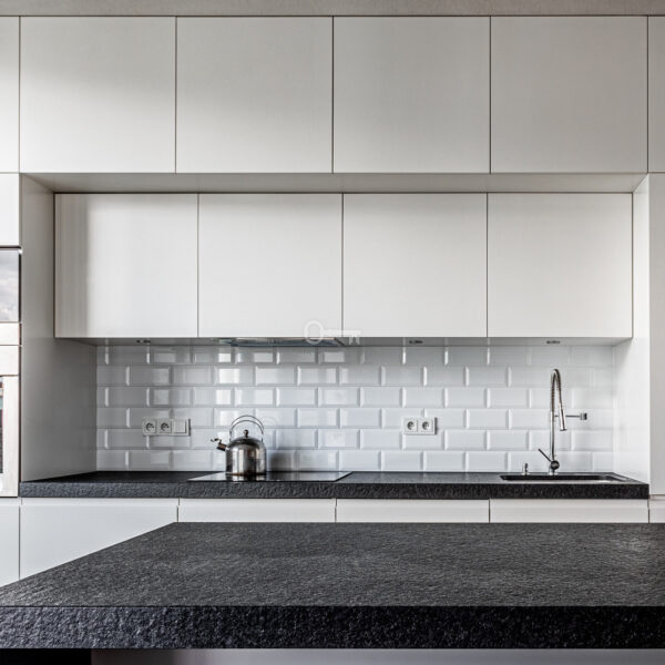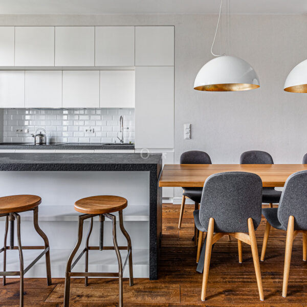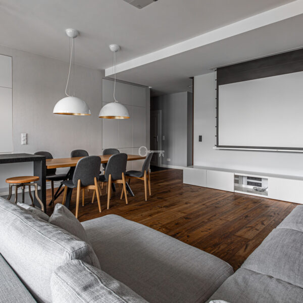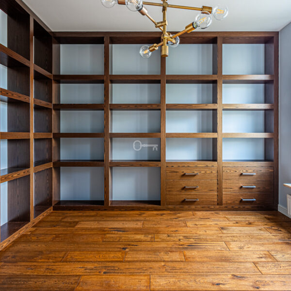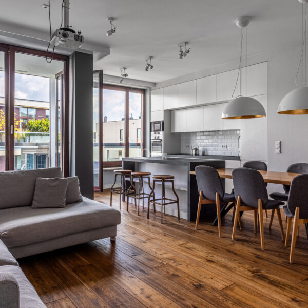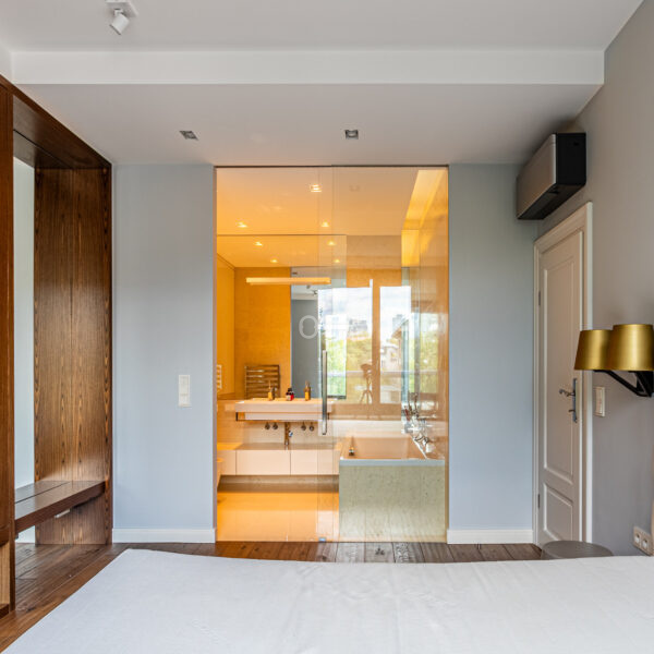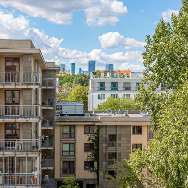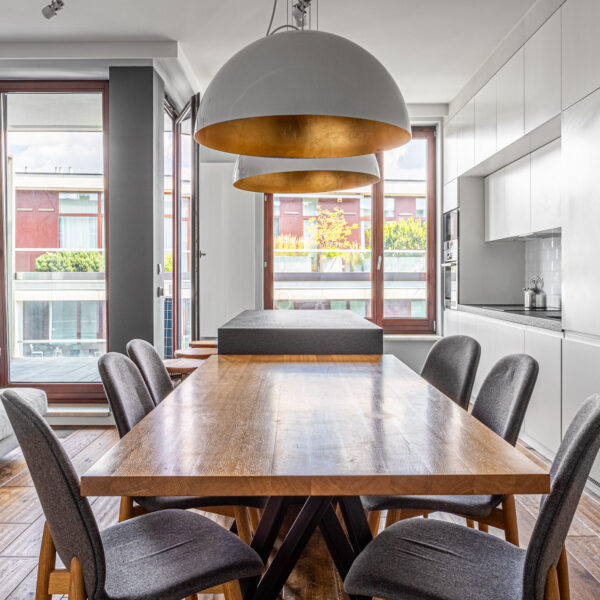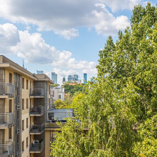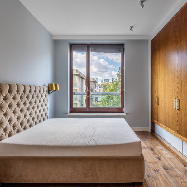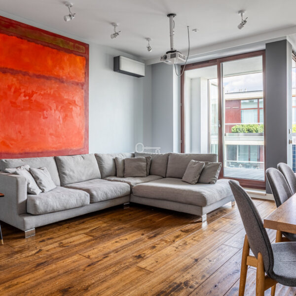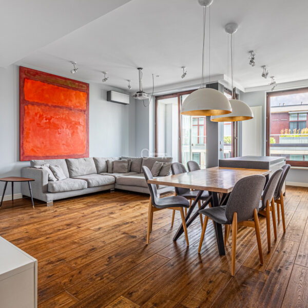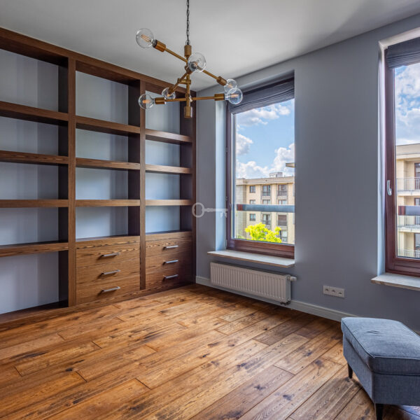 Mieszkanie wyróżnia się dokładnie dobranymi dodatkami i spójną aranżacją wnętrza. Drewniane podłogi, zabudowane szafy i miejsca do przechowywania oraz kamienne łazienki. Z balkonu rozciąga się piękny widok na ogrody Biblioteki Uniwersytetu Warszawskiego.