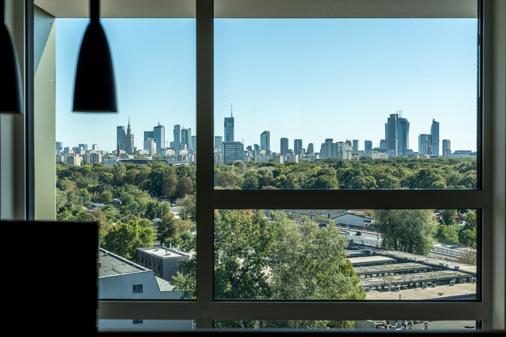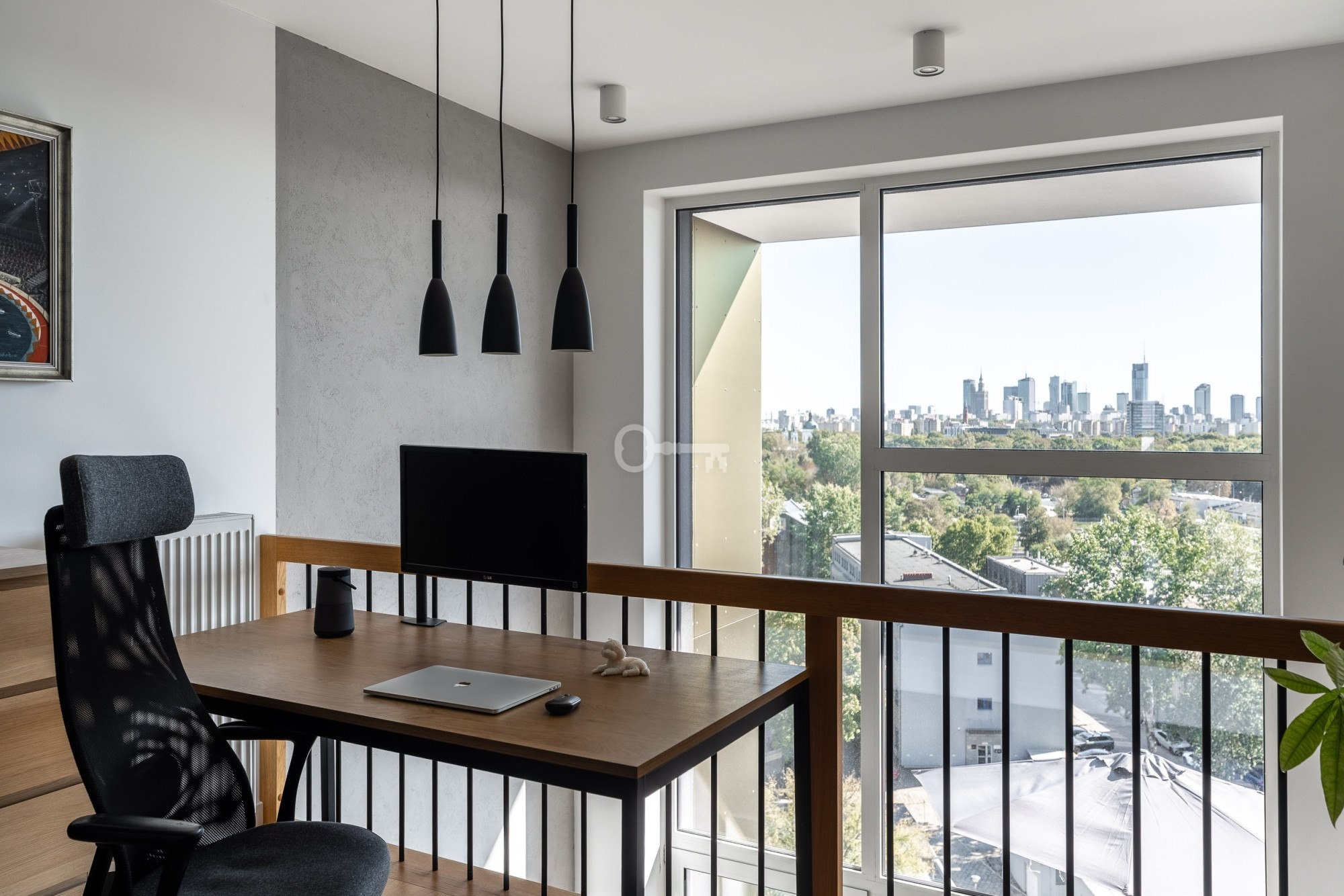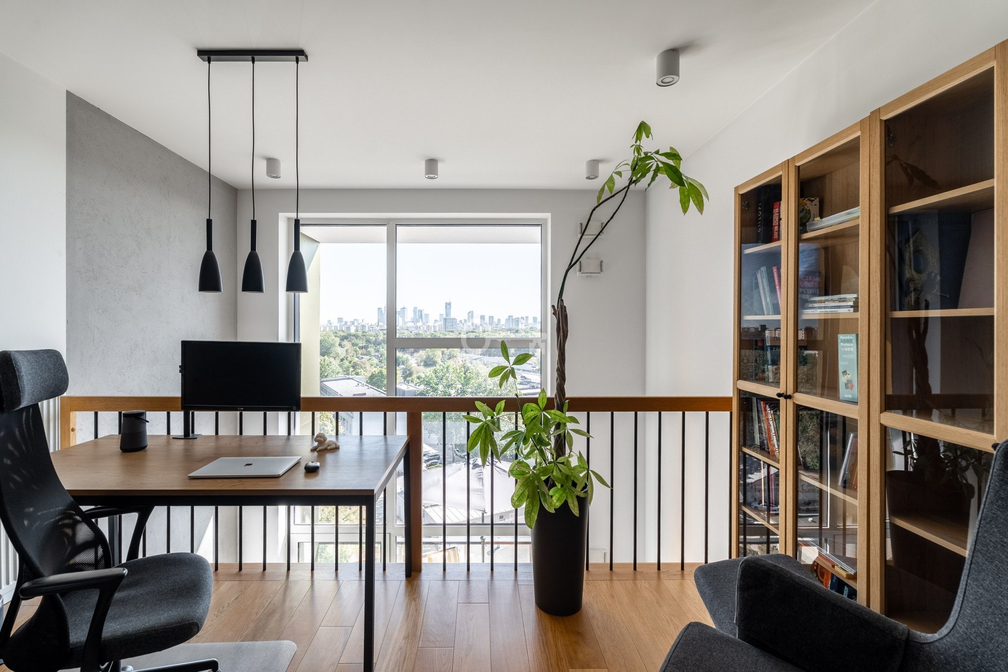 * gabinet w otwartej przestrzeni nad salonem z inspirującym panoramicznym widokiem na Warszawę.