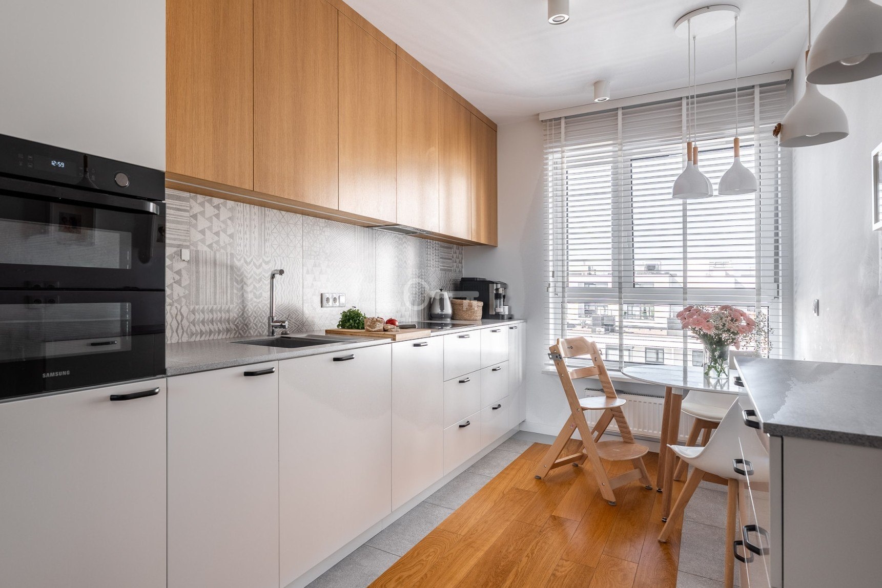 Apartament jest kompletnie wyposażony i gotowy do zamieszkania. Wykończony z dbałością o detale, z wykorzystaniem wysokiej jakości materiałów (m.in naturalne drewno na podłodze i elementach wykończenia, zabudowy meblowe na wymiar). W mieszkaniu zainstalowana jest klimatyzacja.