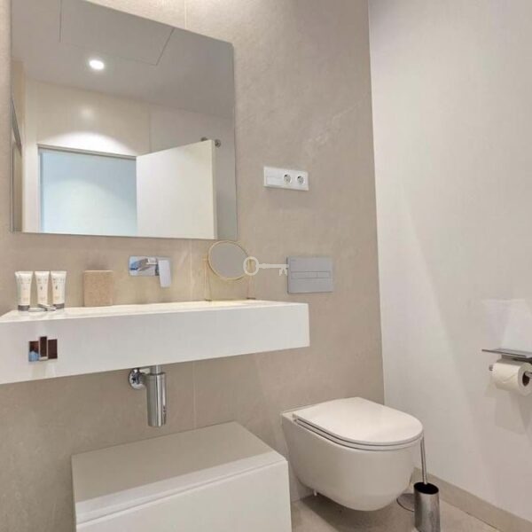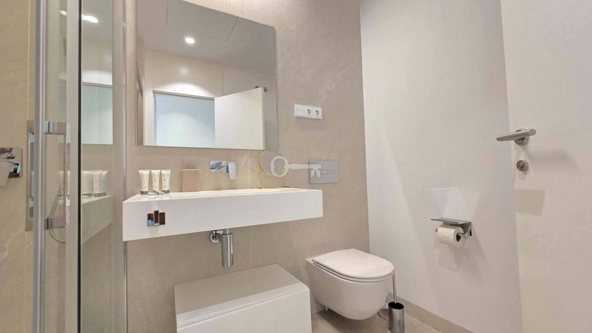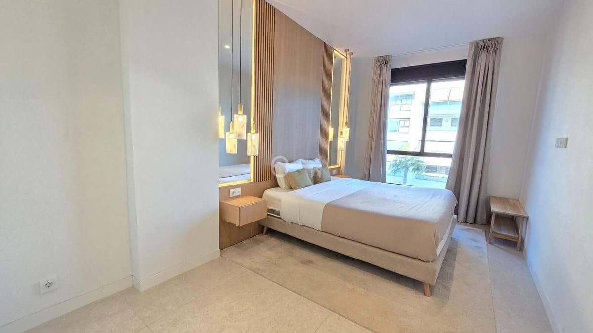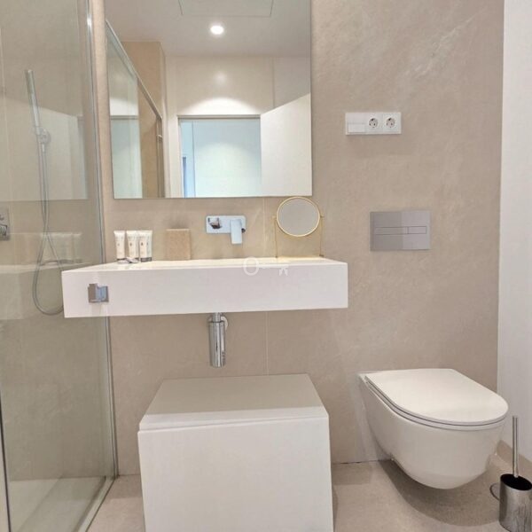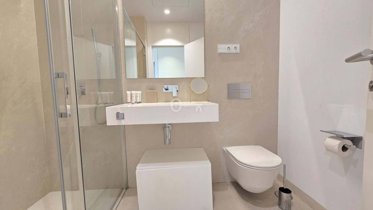 Salon i jadalnia na otwartym planie łączą się z dużym prywatnym tarasem, z którego można podziwiać niezrównane widoki na Morze Śródziemne i niezapomniane zachody słońca. Designerska kuchnia, wyposażona w najnowocześniejsze urządzenia, kwarcowe blaty i eleganckie meble, zapewnia zarówno styl, jak i funkcjonalność. Apartament oferuje również prywatny balkon idealny do spożywania posiłków na świeżym powietrzu, centralną klimatyzację i funkcje inteligentnego domu.