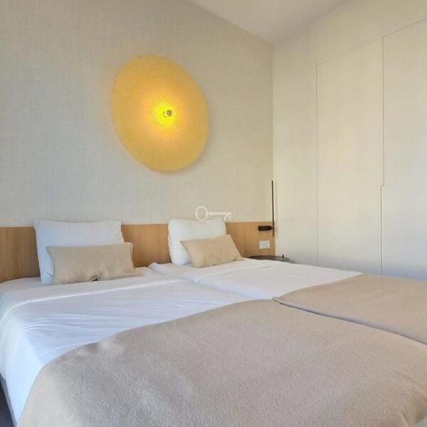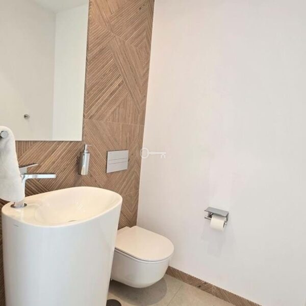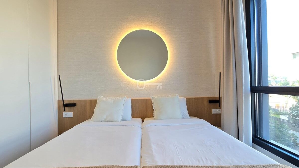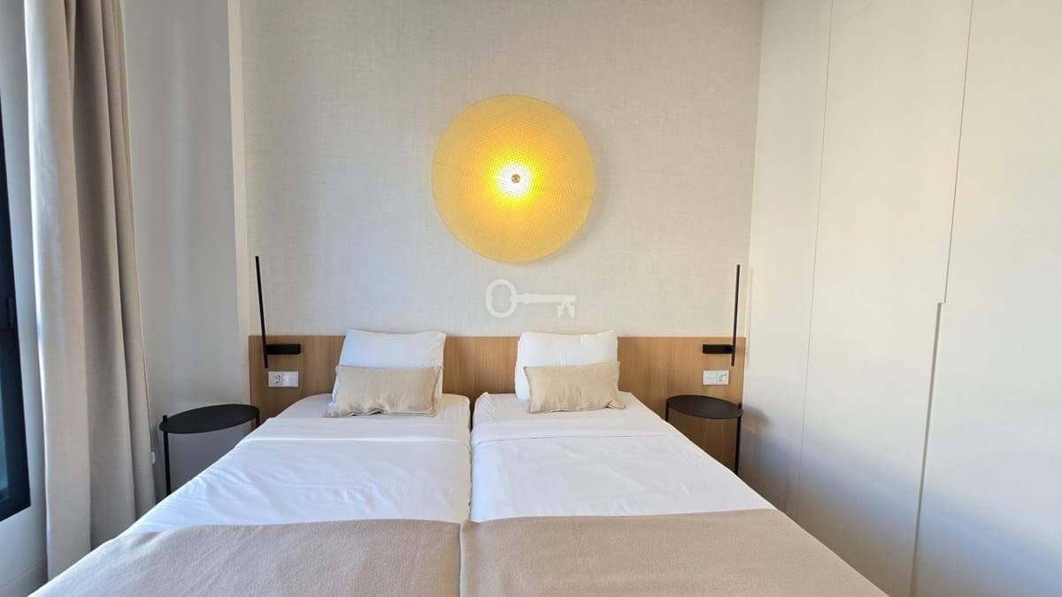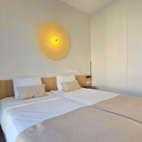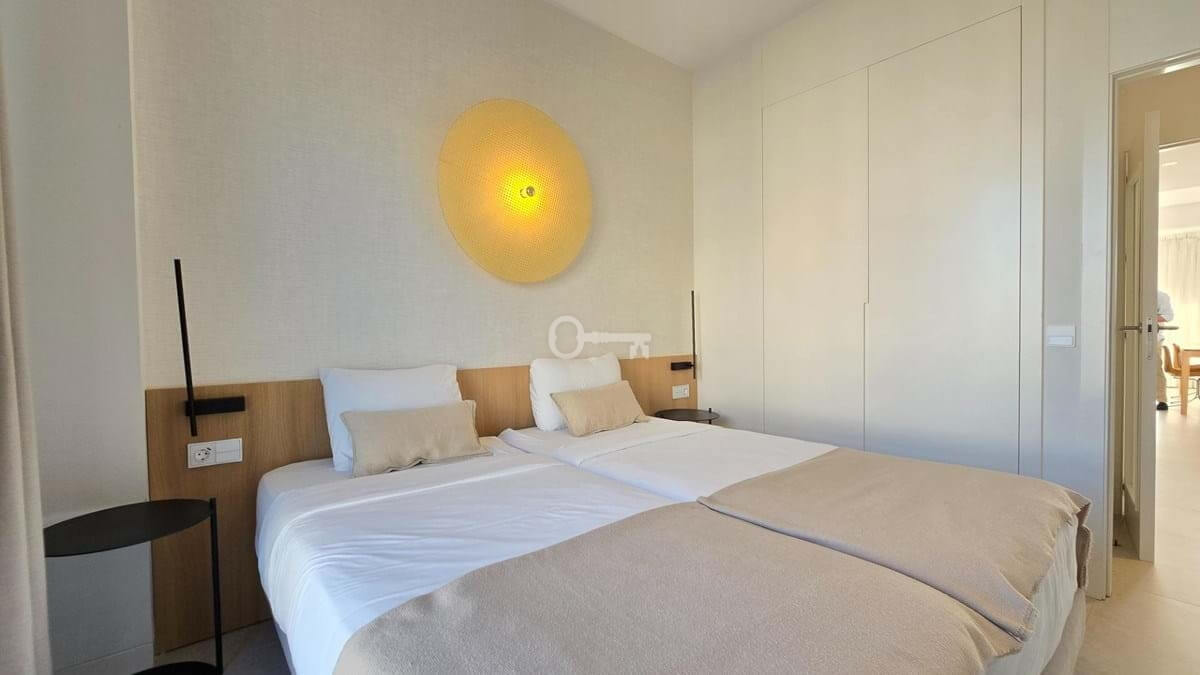Salon i jadalnia na otwartym planie łączą się z dużym prywatnym tarasem, z którego można podziwiać niezrównane widoki na Morze Śródziemne i niezapomniane zachody słońca. Designerska kuchnia, wyposażona w najnowocześniejsze urządzenia, kwarcowe blaty i eleganckie meble, zapewnia zarówno styl, jak i funkcjonalność. Apartament oferuje również prywatny balkon idealny do spożywania posiłków na świeżym powietrzu, centralną klimatyzację i funkcje inteligentnego domu.