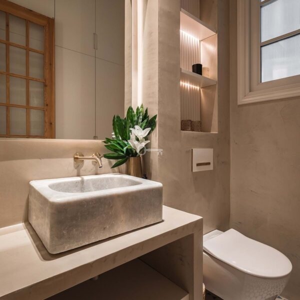 W łazienkach znajdują się elementy Villeroy & Boch i szczotkowana złota armatura Toro Bath, a także stonowane meble Inbani. Oświetlenie, zaprojektowane przez Eflux, dyskretnie podkreśla architekturę, podczas gdy meble Pianca, tkaniny Casamance i ręcznie dmuchane szklane oprawy Bomma uzupełniają otoczenie, które łączy historię, design i komfort z równowagą i naturalnością.