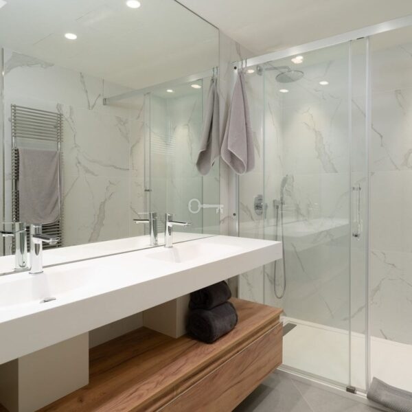 There are three generous bedrooms, each with its own en suite bathroom. A fourth room, currently used as an office, can easily function as an additional bedroom, dressing room or multifunctional space. Two bedrooms are located on the main living level in a separate wing to enhance privacy, while the third bedroom is positioned on the upper level. A guest toilet completes the layout.