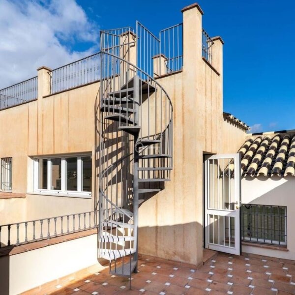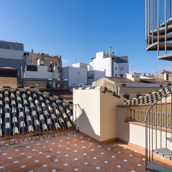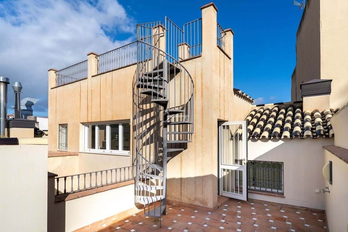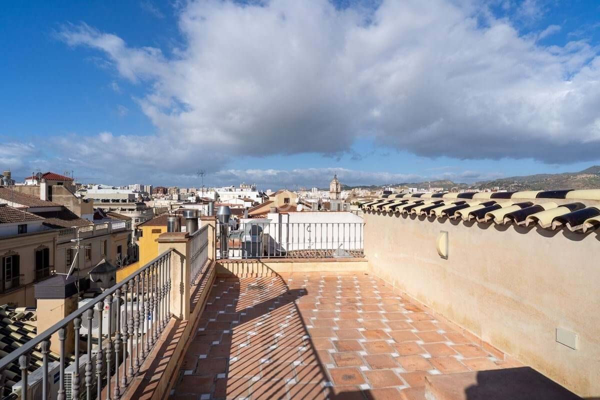 On the upper level, a second terrace is situated on the same floor as the third bedroom. From this level, an elegant spiral staircase leads to the rooftop terrace. From this elevated position, you enjoy open views towards Málaga Cathedral, partial views of the port and the sea, as well as panoramic views over the rooftops of the historic centre and the surrounding hills.