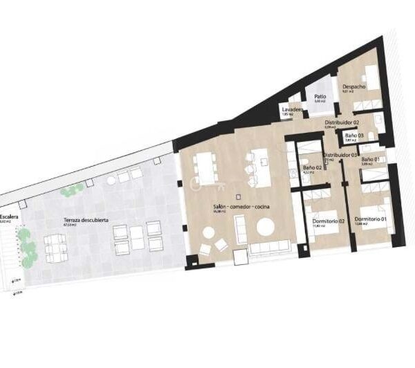 From the living area there is direct access to a spectacular 70-square-meter terrace, a true luxury in such a central location. This outdoor space offers multiple possibilities: a relaxation area, an outdoor dining space or a landscaped area, ideal for enjoying the climate and special moments in a private setting.