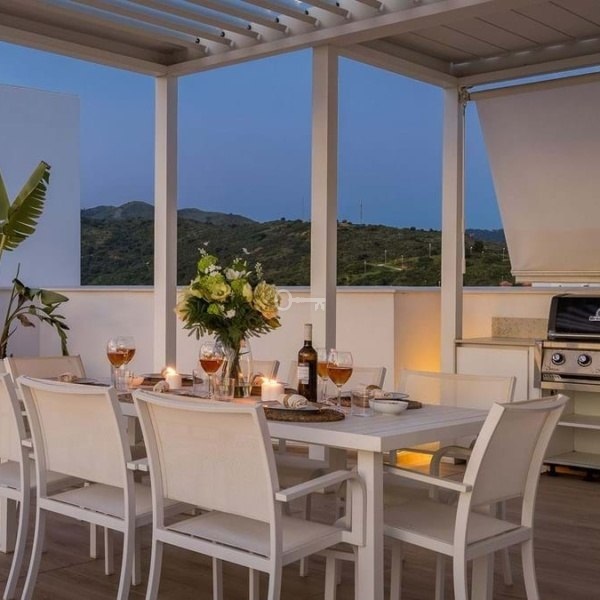 Jedną z najlepszych części tego domu jest przestrzeń zewnętrzna – a jest jej mnóstwo. Dzięki 173 m² słonecznych tarasów, w tym ogromnemu solarium na dachu, będziesz miał wszystko, czego potrzebujesz, aby chłonąć śródziemnomorski styl życia. Wypoczywaj przy prywatnym basenie, zrelaksuj się w strefach relaksu lub goszcz rodzinę i przyjaciół w kuchni na świeżym powietrzu z wbudowanym grillem i jadalnią – a wszystko to z fantastycznym widokiem na morze i pole golfowe.