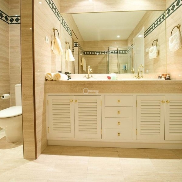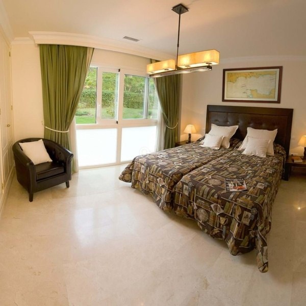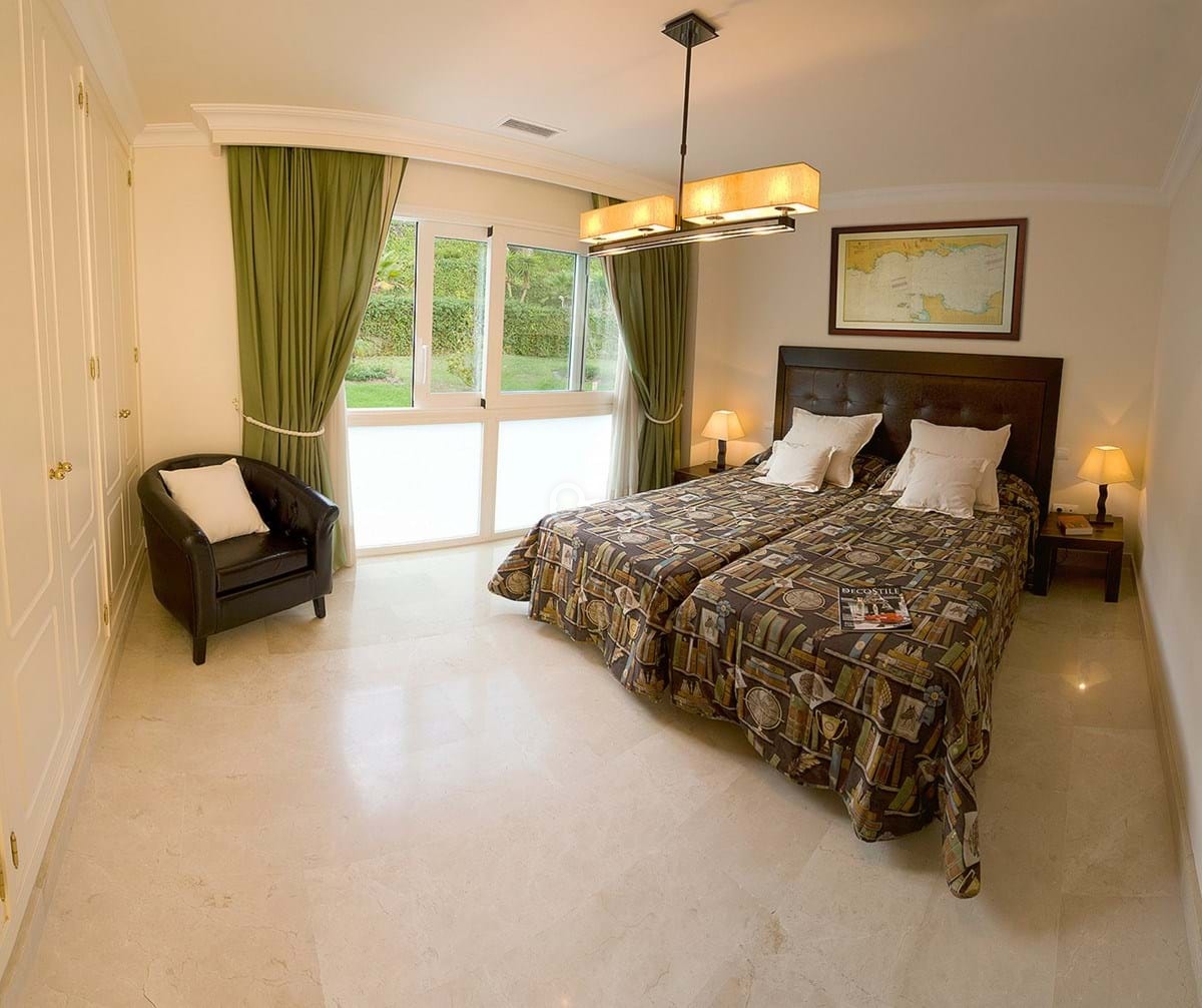 Apartament jest otwarty i przestronny, z 2 dużymi dwuosobowymi sypialniami, obie z łazienkami. Każdy pokój jest jasno oświetlony naturalnym światłem, które wpada przez okna tarasowe. Obie sypialnie mają w pełni wyposażone szafy, marmurowe podłogi i widoki na ogrody.