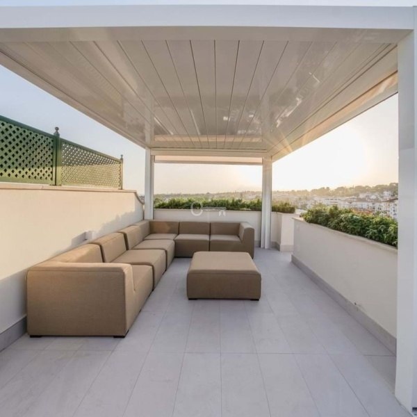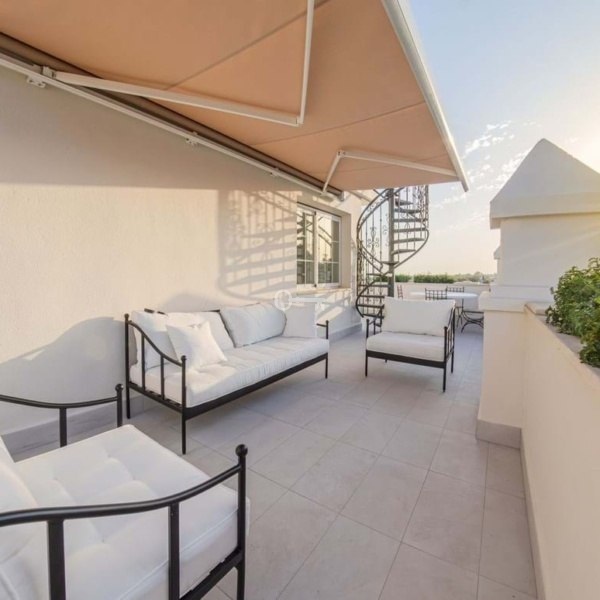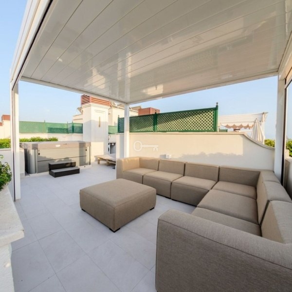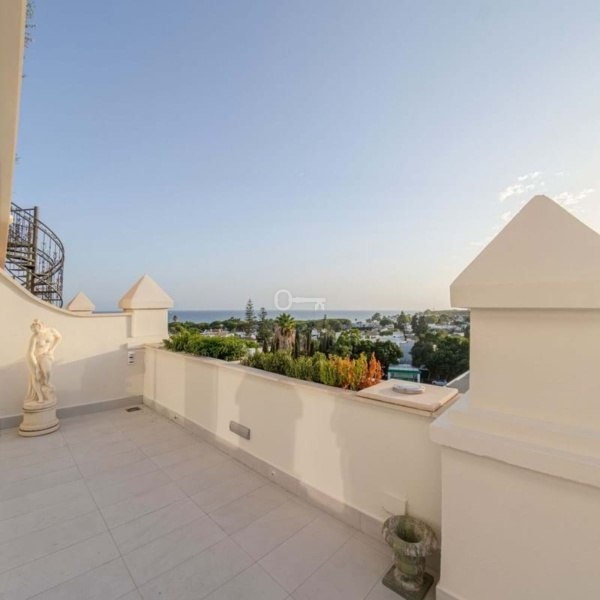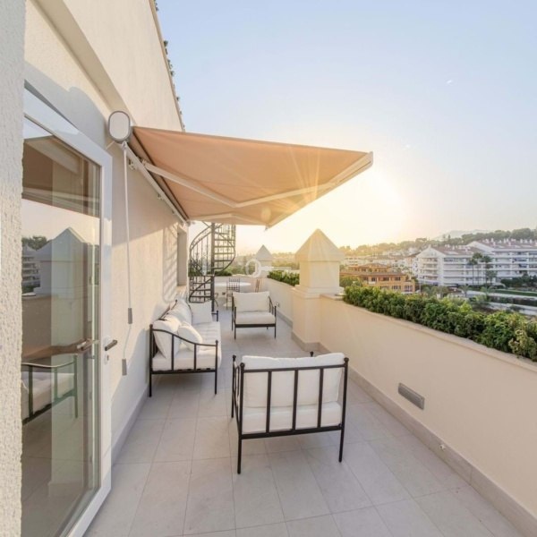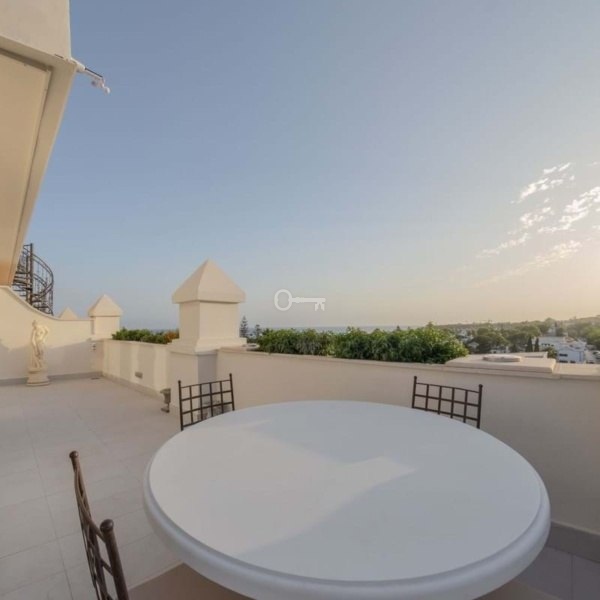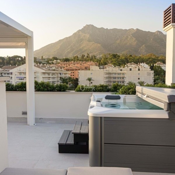 Jedną z głównych atrakcji tego penthouse’u jest otulający taras, który otacza cały dom i oferuje spektakularne widoki zarówno na morze, jak i góry otaczające Marbellę. Orientacja na zachód pozwala cieszyć się pięknymi zachodami słońca i naturalnym światłem, które wypełnia każdy zakątek domu w ciągu dnia. Dodatkowo na tarasie znajduje się prywatne solarium wyposażone w jacuzzi i strefę relaksu, idealne do relaksu, rozrywki z przyjaciółmi lub spędzania niezapomnianych chwil na świeżym powietrzu. Eleganckie spiralne schody łączące taras z solarium dodają odrobinę wyróżnienia i sprawiają, że dostęp do tych przestrzeni zewnętrznych jest łatwy i stylowy.