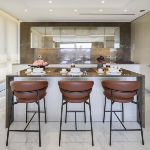 Kuchnia, wyjątkowy element centralny, została starannie wykonana i umeblowana przez prestiżową Fendi Casa, łącząc estetyczną elegancję z funkcjonalnością na najwyższym poziomie. Każdy szczegół świadczy o jakości, od wyrafinowanej stolarki po płynną integrację materiałów i wykończeń. Okna sięgające od podłogi do sufitu zalewają przestrzenie naturalnym światłem i oferują zapierające dech w piersiach panoramiczne widoki, które można podziwiać zarówno z tarasów na głównym piętrze, jak i z rozległego solarium.