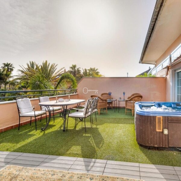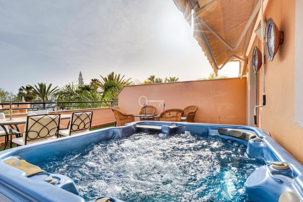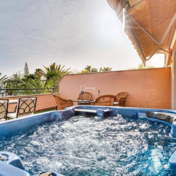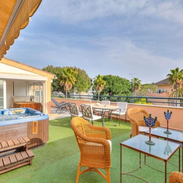Posiada ogromny taras o powierzchni 60 m2 od strony południowej. Taras jest nasłoneczniony przez cały dzień i zapewnia dużo prywatności. Znajduje się tam również jacuzzi.