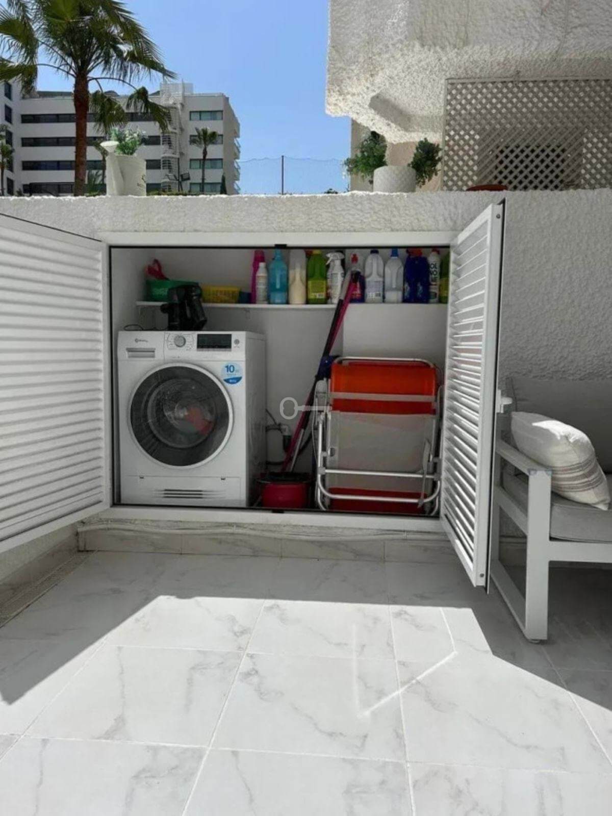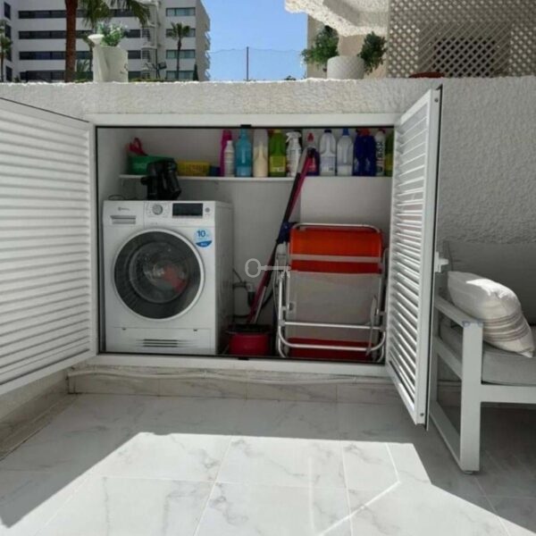 Odnowiony apartament na sprzedaż. Jedna sypialnia, zupełnie nowa łazienka, amerykańska kuchnia z dużą ilością miejsca do przechowywania, dwie wbudowane szafy, klimatyzacja ciepło/zimno i grzejniki elektroniczne. Gładka farba. Pośrednie światła o regulowanej intensywności i wnęki na obwodzie do tworzenia atmosfery. Bardzo jasne. Zakamuflowane designerskie gniazdka. Na tarasie zbudowano pomieszczenie na pralkę i schowek. Posiada pralko-suszarkę. Markiza elektryczna. Mieszkanie ma 58 metrów kwadratowych, a taras 30 metrów kwadratowych. Zupełnie nowy podgrzewacz ciepłej wody. Woda nie jest płatna, jest wliczona w opłatę komunalną. Możliwość zrobienia drugiej sypialni, ponieważ powierzchnia domu jest duża. Cicha urbanizacja zaprojektowana przez architekta Fernando Higuerasa, z tropikalnym ogrodem, z dwoma basenami, fontannami, sztuczną rzeką z rybami, żabami, kaczkami … . POSIADA BEZPOŚREDNI DOSTĘP DO PLAŻY, bez konieczności przechodzenia przez ulicę, dwa prysznice po powrocie z plaży w celu usunięcia piasku, z bezpośrednim dostępem do basenu z plaży.