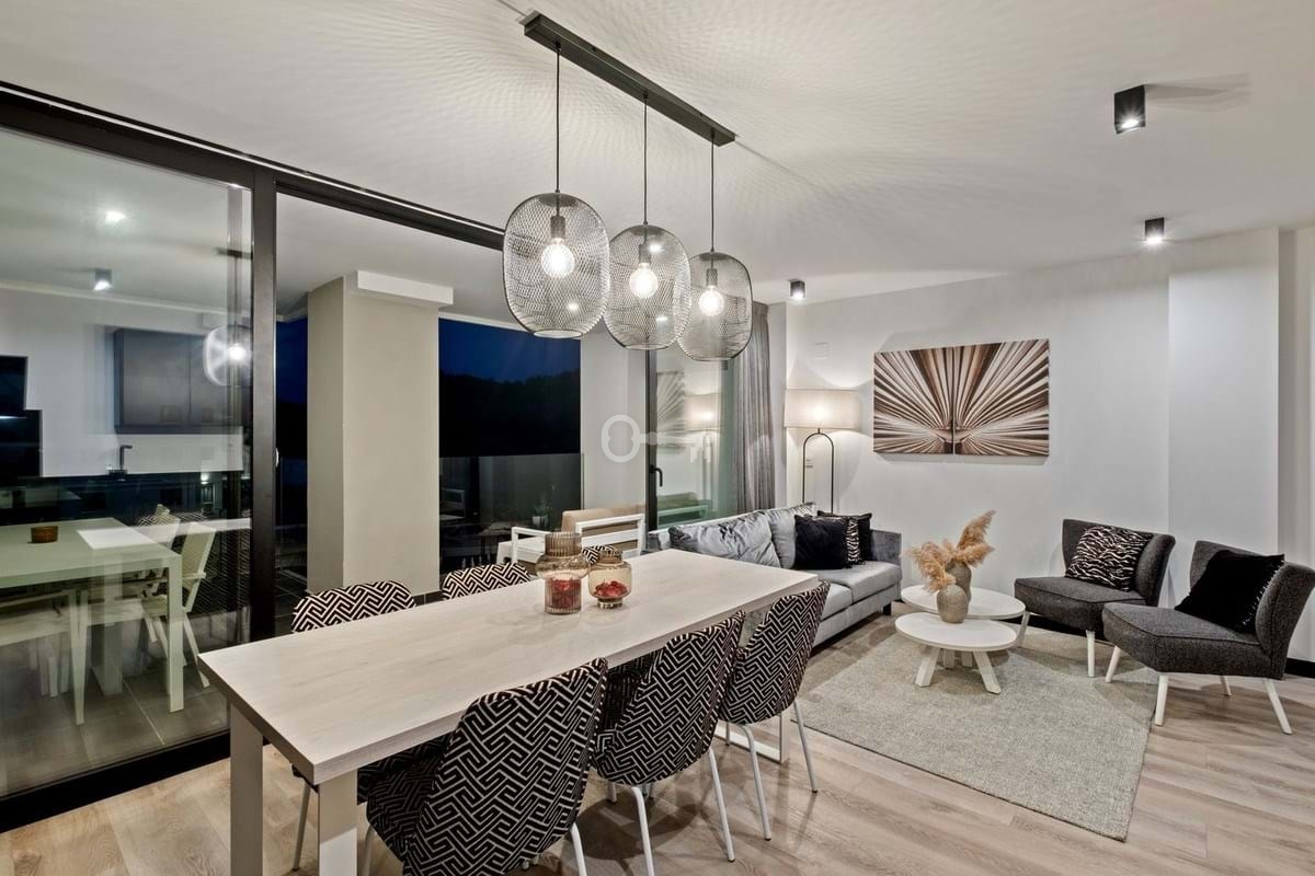 Wewnątrz znajduje się jasna część dzienna z dużymi przesuwanymi szklanymi drzwiami, które otwierają się na częściowo zadaszony taras, tworząc płynną przestrzeń wewnątrz i na zewnątrz. Nowoczesna kuchnia na otwartym planie posiada dużą wyspę kuchenną i jest w pełni wyposażona w piekarnik, płytę elektryczną, zmywarkę i ekspres do kawy Nespresso.