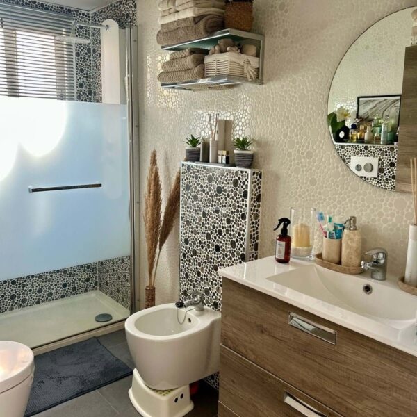 Wewnątrz znajduje się główna sypialnia z wbudowaną szafą, stylowa łazienka wykończona wysokiej jakości porcelaną oraz nowoczesna kuchnia wyposażona w elegancki blat Silestone, idealny dla osób ceniących zarówno elegancję, jak i praktyczność.