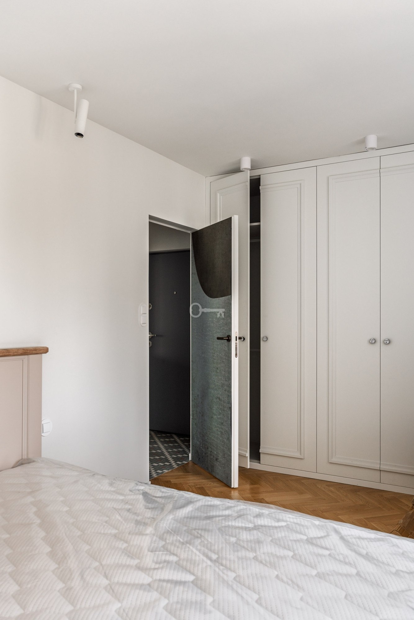 * cicha sypialnia od strony podwórza z szafami w zabudowie,