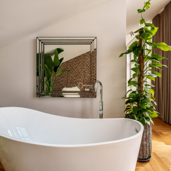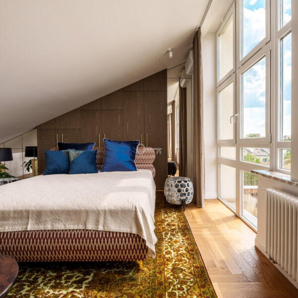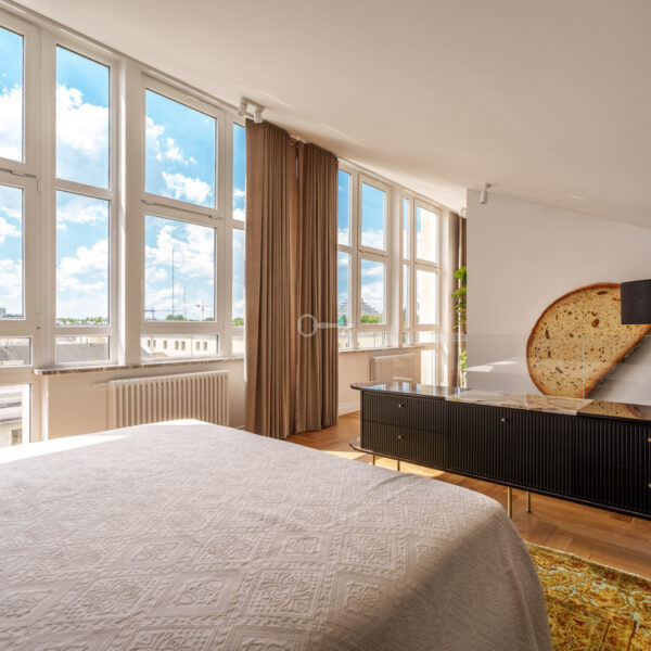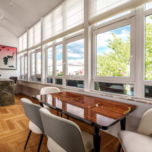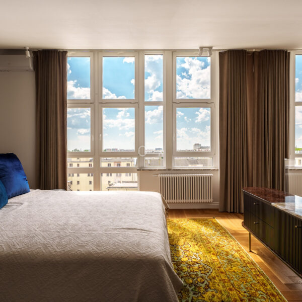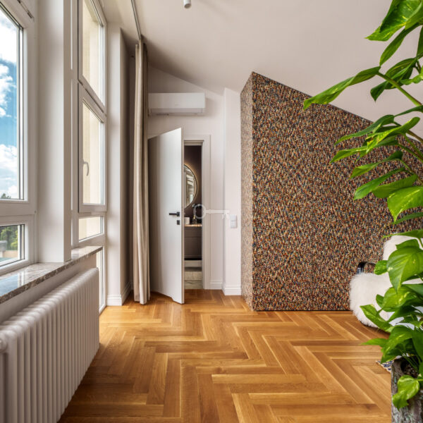 Kamienica z 1935 r. po generalnym remoncie włącznie ze wszystkimi instalacjami. Trzy lata temu nadbudowana od strony zachodniej gdzie znajduje się prezentowany dwupoziomowy lokal o powierzchni użytkowej 111m2. Unikatowa nieruchomość przez ogromną ilość okien i tym samym doświetlenie wnętrz. Pomieszczenia klimatyzowane, a intymność i zacienienie daje zintegrowany system elektrycznych rolet i zasłon działający na pilot.