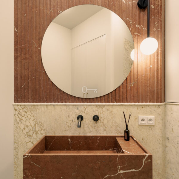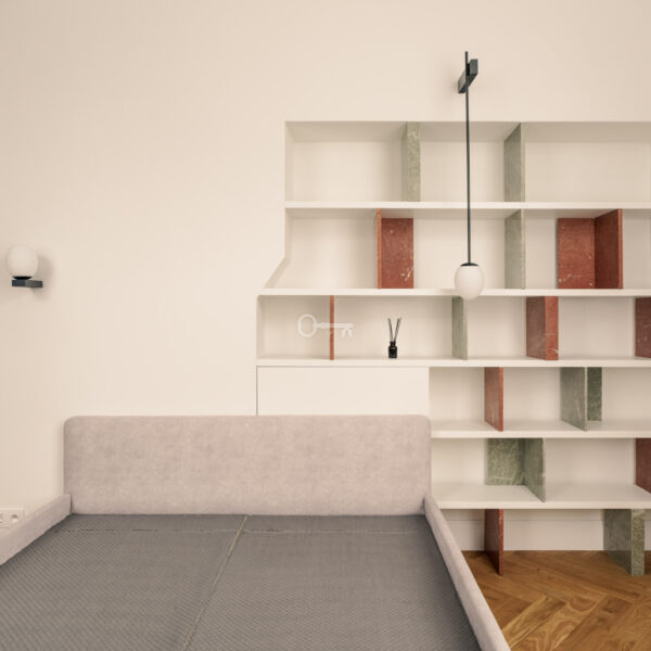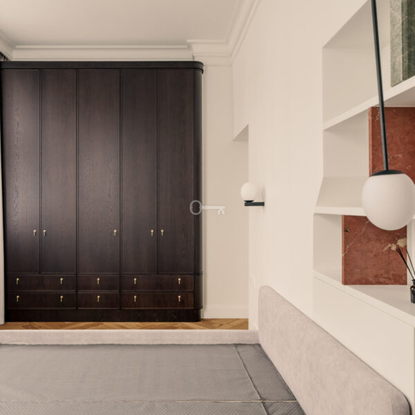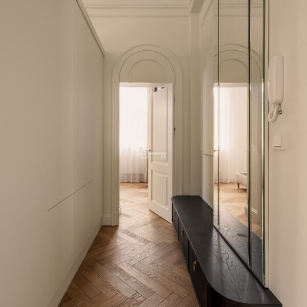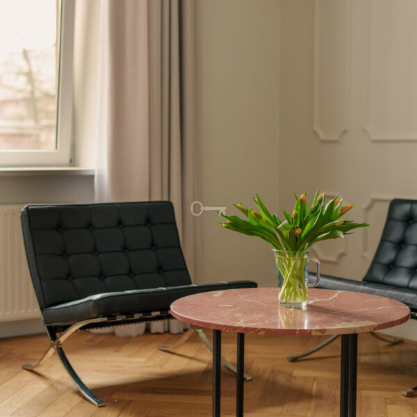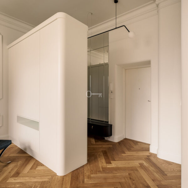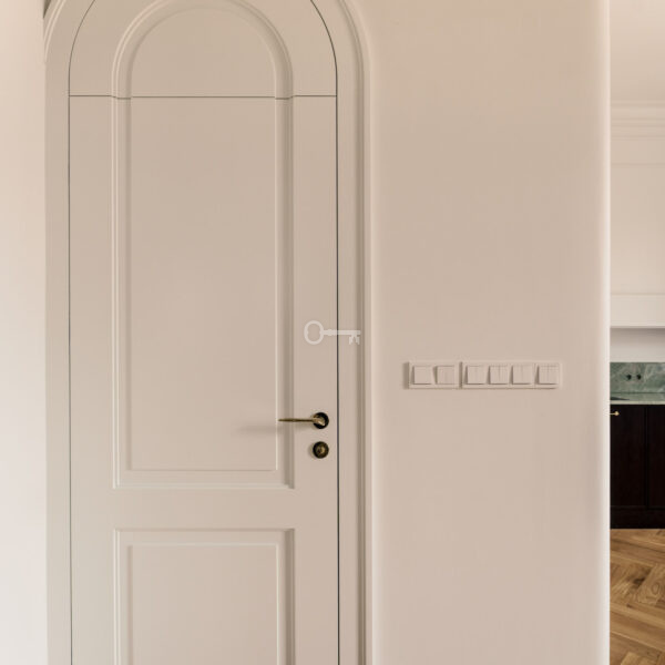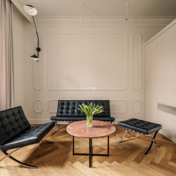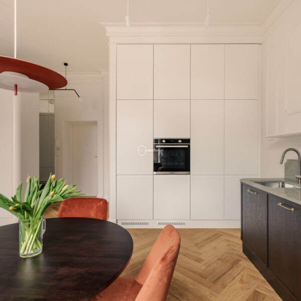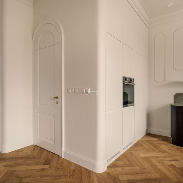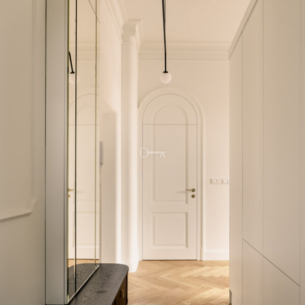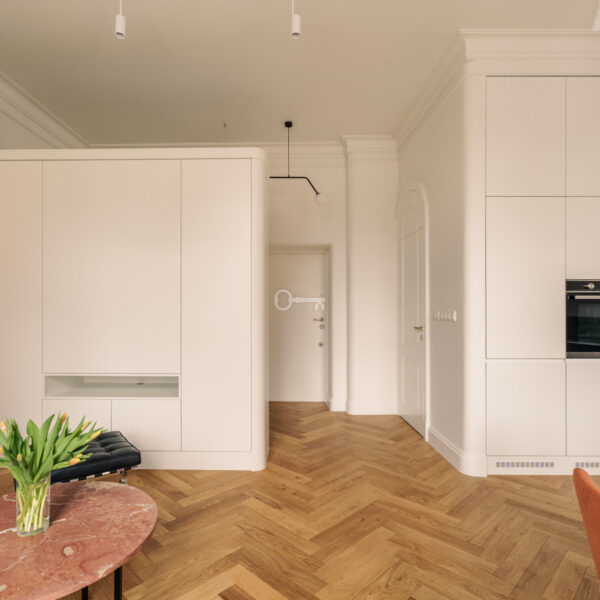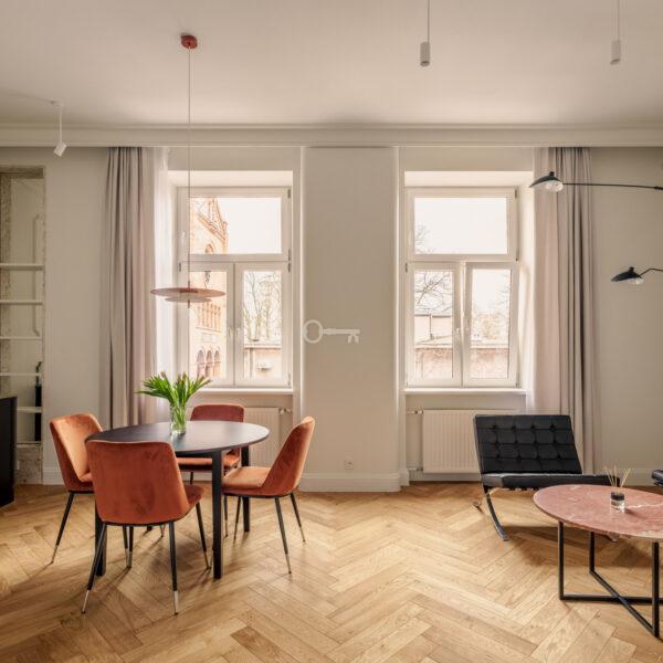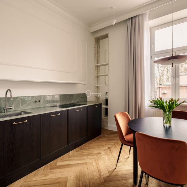 Mieszkanie jest wykończone przy użyciu najwyższych materiałów z dbałością o każdy szczegół estetyczny. Ta historyczna część kamienicy ostała się jako jedyna nietknięta przez wojnę. Zachowany został oryginalny układ wnętrz, a wykorzystane przy wykończeniu szlachetne materiały tworzą ponadczasowe, luksusowe wnętrze.