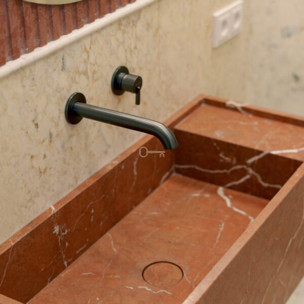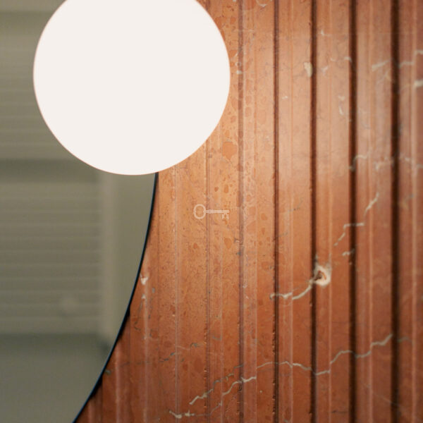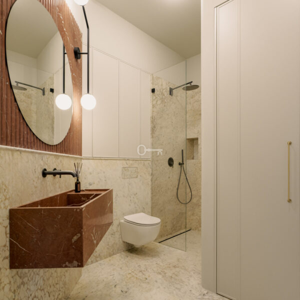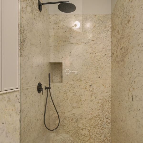 Łazienka z prysznicem o powierzchni wyłożona marmurem wraz z deszczownicą. Pod ryflowaną ścianą z lustrem znajdziemy kamienną umywalkę. Naprzeciwko drzwi wysoka szafa z miejscem na pralkę i suszarkę, z szufladą na pranie oraz półkami na ręczniki.