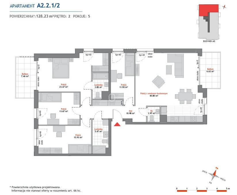 Apartament 5 pokojowy w stanie deweloperskim o powierzchni 128,08 m2, z ekspozycją wschodnio-północną, usytuowany na II piętrze.
