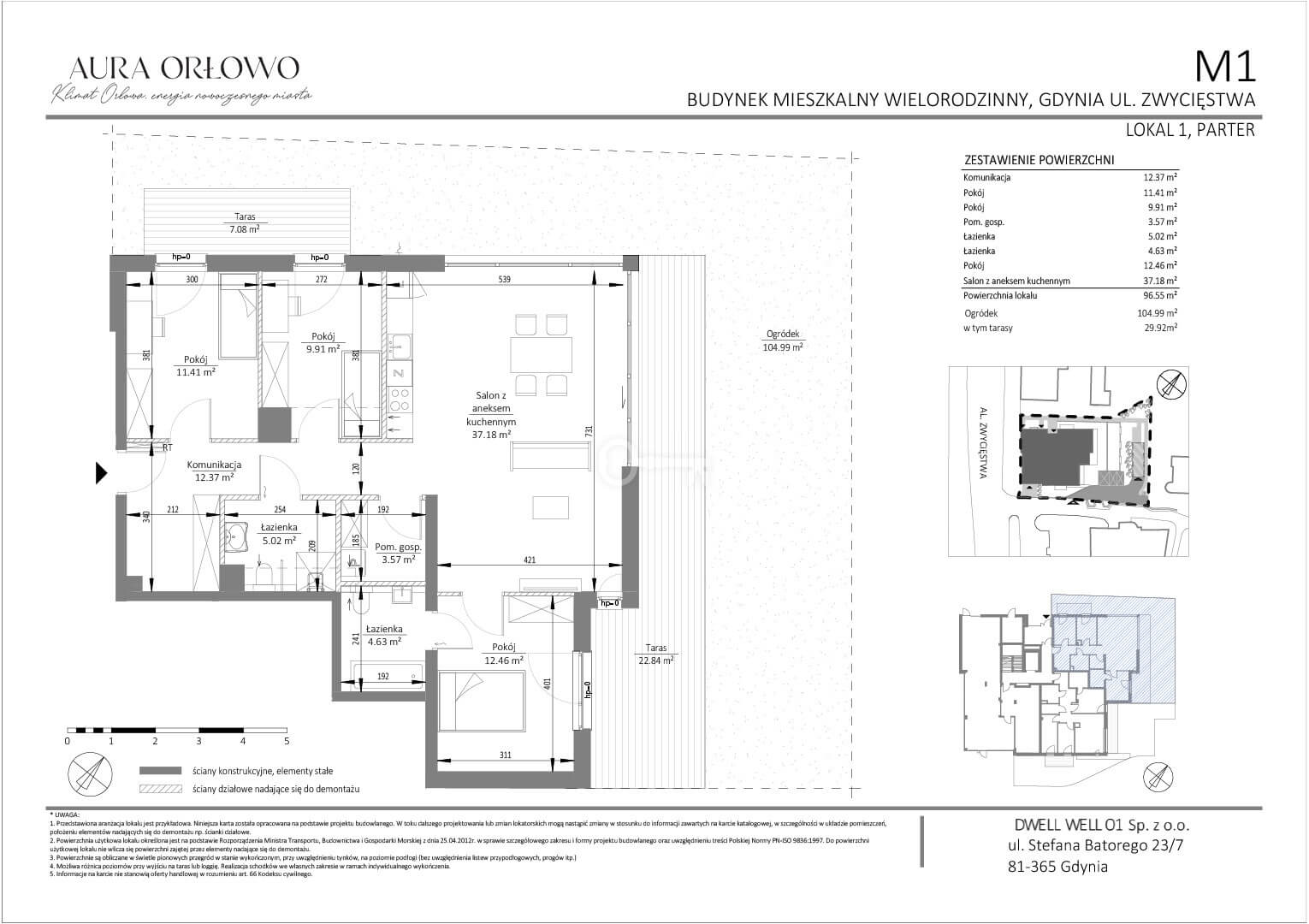 Wyjątkowy apartament o powierzchni 96,55 m² z przestronnym ogródkiem o powierzchni 104,99 m² (w tym tarasy o pow. 29,92 m²), zlokalizowany w kameralnym budynku Aura Orłowo w Gdyni Orłowo przy Al. Zwycięstwa 195. To wyjątkowa propozycja dla osób ceniących nowoczesny design, funkcjonalność i bliskość natury. Idealne miejsce dla rodziny lub osób poszukujących komfortowej przestrzeni w prestiżowej lokalizacji.