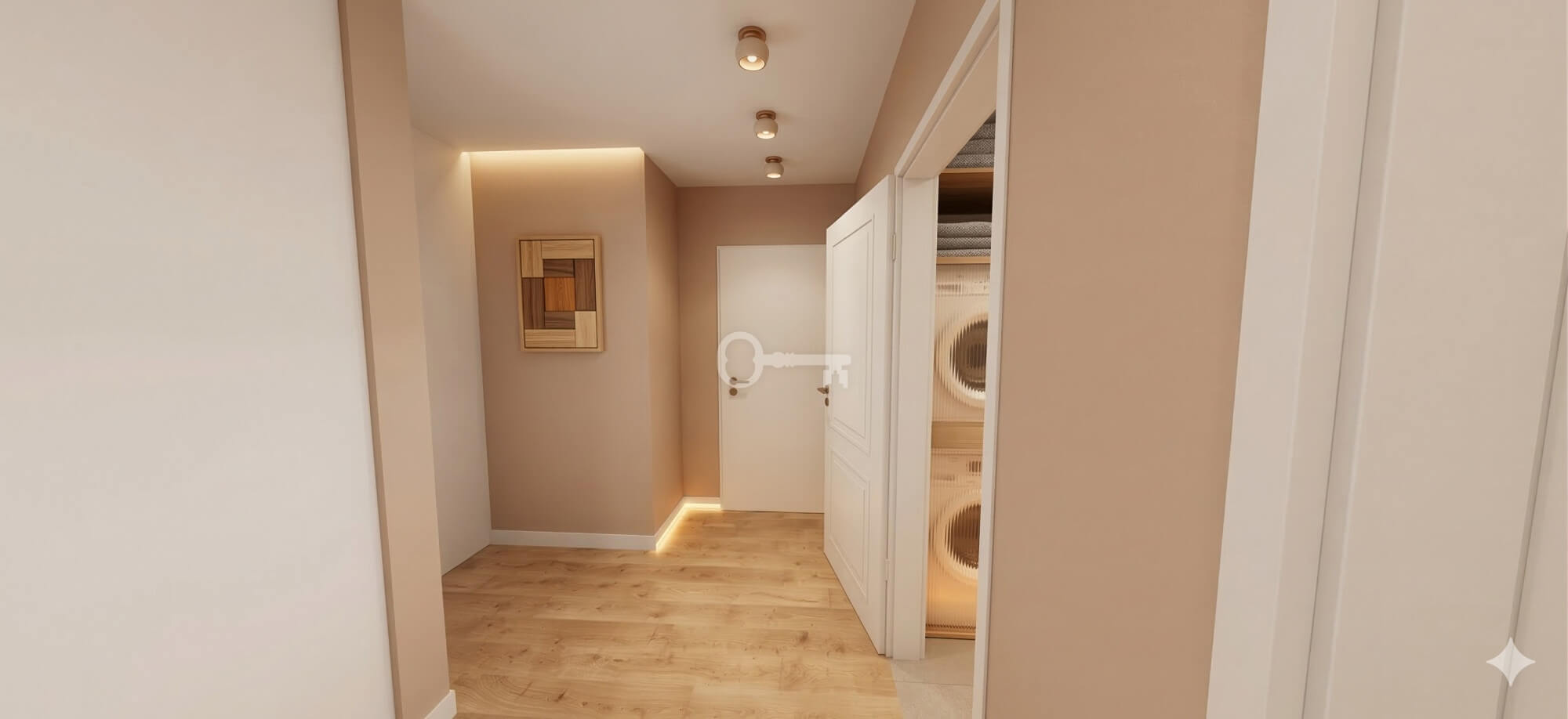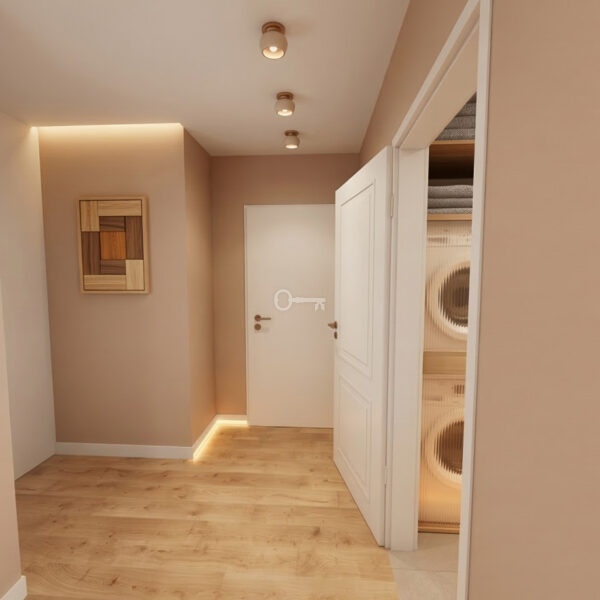 * przedpokój (4,34 m²): Bardzo obszerna strefa komunikacyjna, oferująca mnóstwo miejsca na pojemne szafy wnękowe i organizację przechowywania,