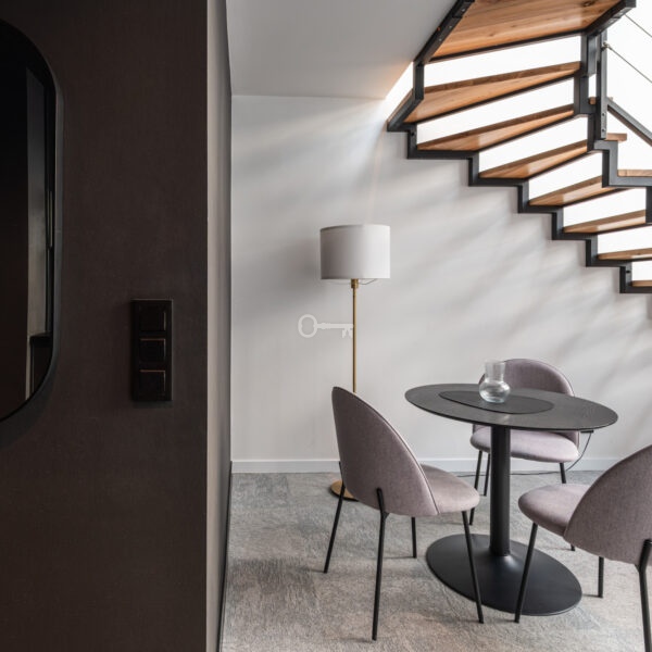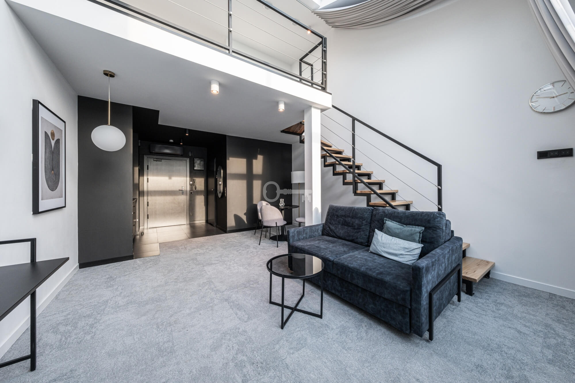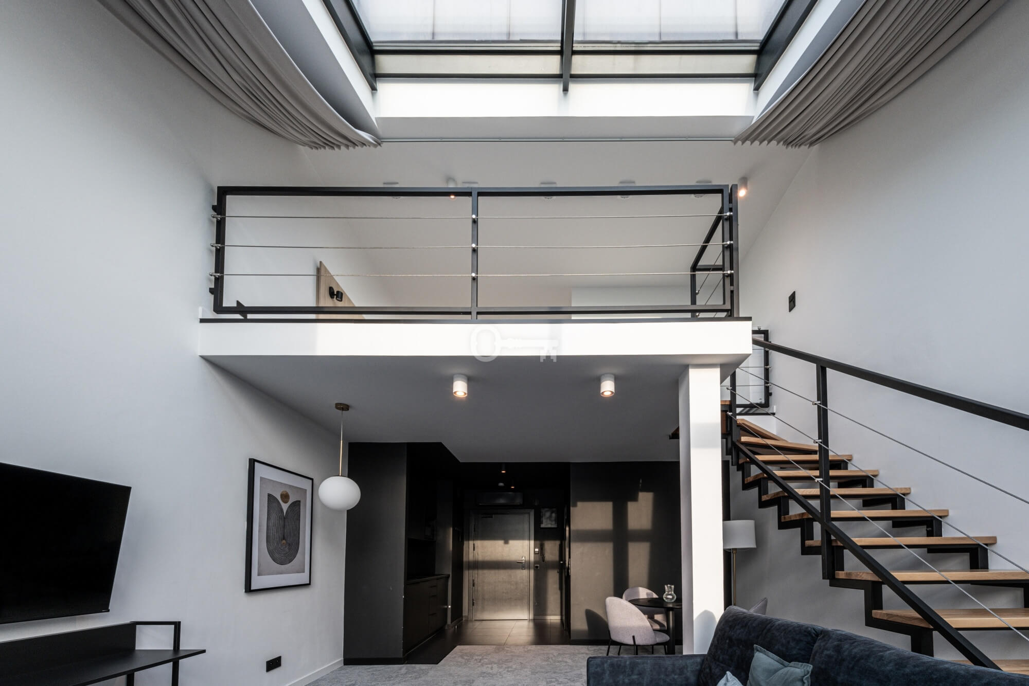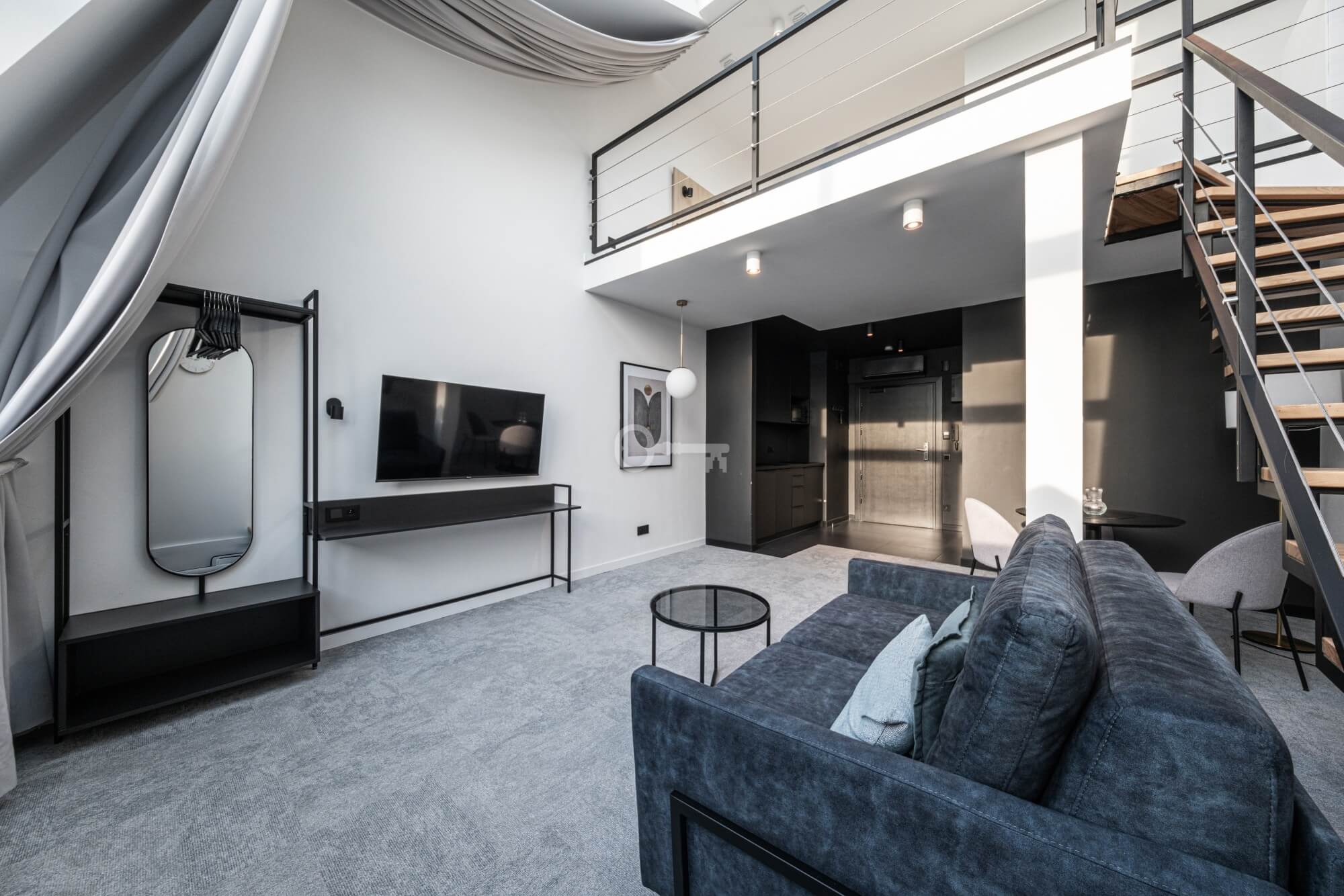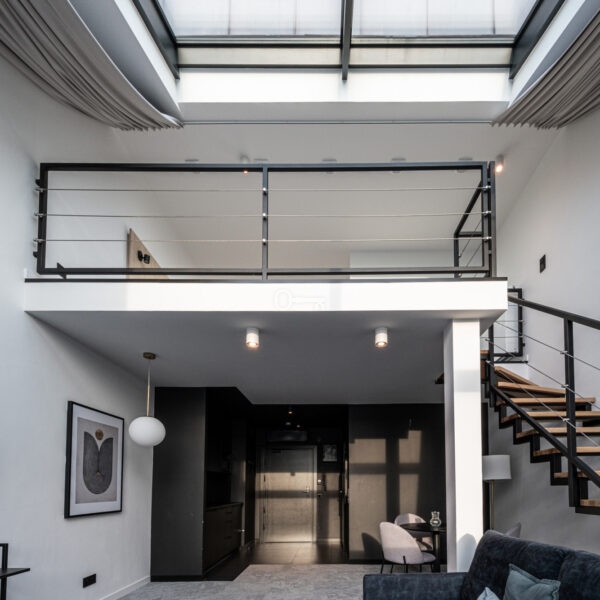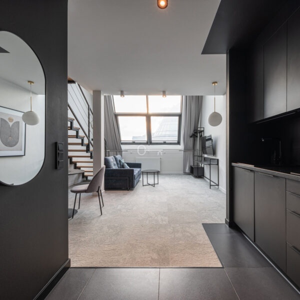 Prezentowany lokal to nowocześnie zaprojektowany, dwupoziomowy apartament z funkcjonalnym podziałem na strefę dzienną i nocną/wypoczynkową.