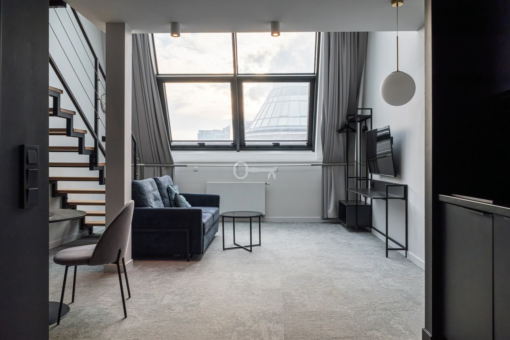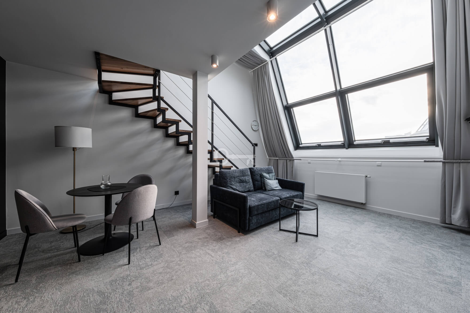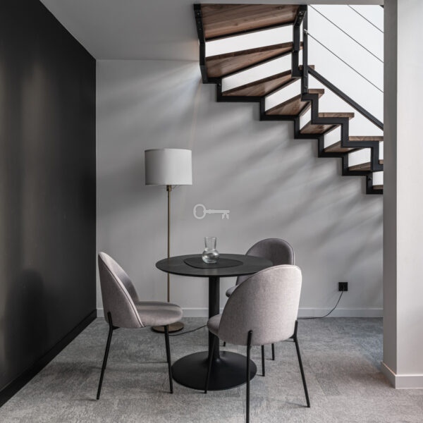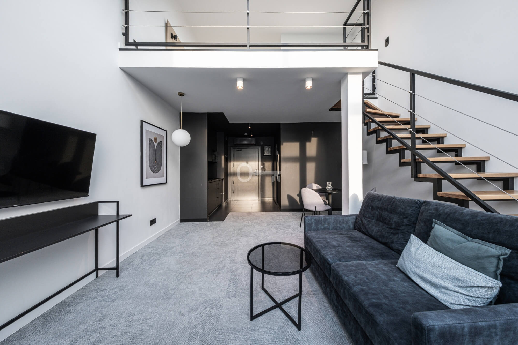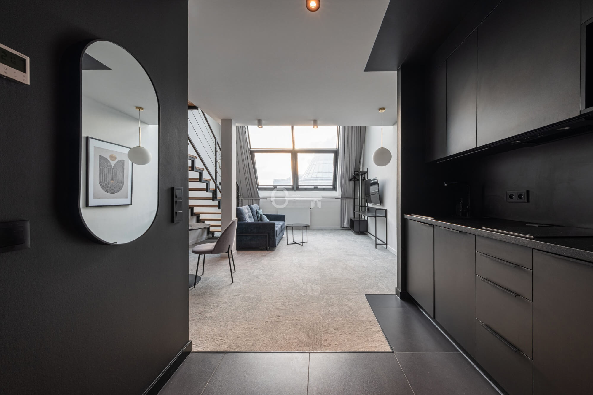 Prezentowany lokal to nowocześnie zaprojektowany, dwupoziomowy apartament z funkcjonalnym podziałem na strefę dzienną i nocną/wypoczynkową.