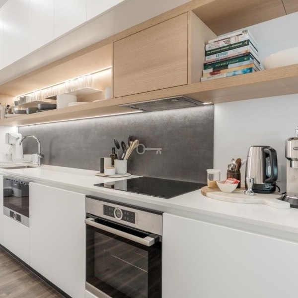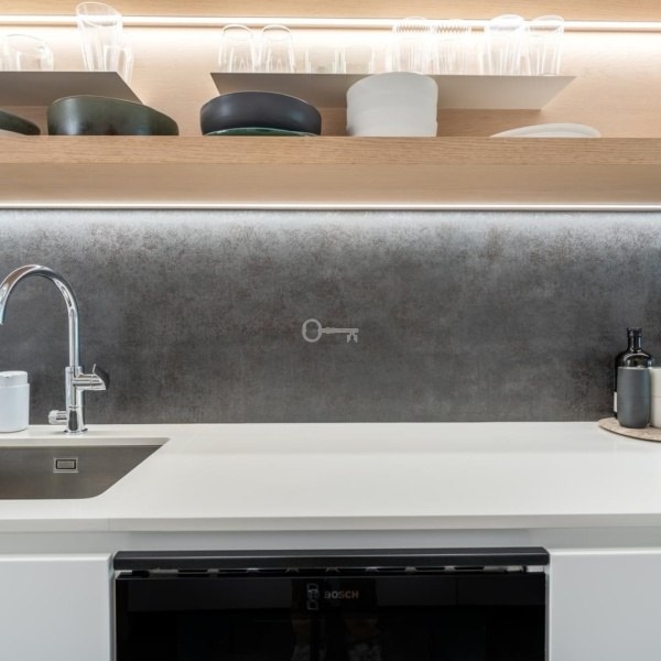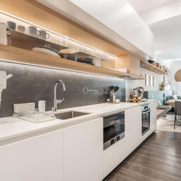 Wystrój apartamentu został starannie zaprojektowany, aby stworzyć współczesną atmosferę z wysokiej jakości wykończeniami. Otwarta kuchnia i salon z balkonem tworzą przestronne i przyjazne środowisko, idealne do spotkań towarzyskich i relaksu. Kuchnia jest w pełni wyposażona w wysokiej klasy urządzenia Bosch, zapewniające zarówno funkcjonalność, jak i wyrafinowanie. Pralnia, oddzielona od głównej przestrzeni, wyposażona jest w pralkę i suszarkę, a także podgrzewacz wody o dużej pojemności, oferując dodatkowy komfort i praktyczność.