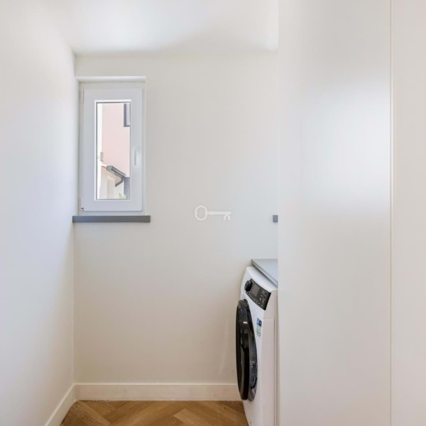 Nieruchomość składa się z salonu z aneksem kuchennym, pralni i pomieszczenia gospodarczego, dwóch sypialni oraz łazienki wyposażonej w prysznic. Remont obejmował wymianę instalacji wodno-kanalizacyjnej i elektrycznej, a także montaż izolacji akustycznej w sufitach i łazience.