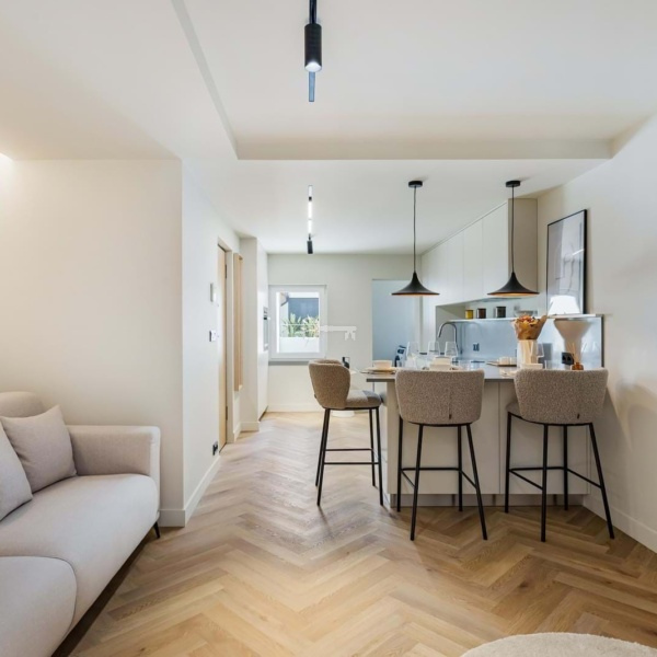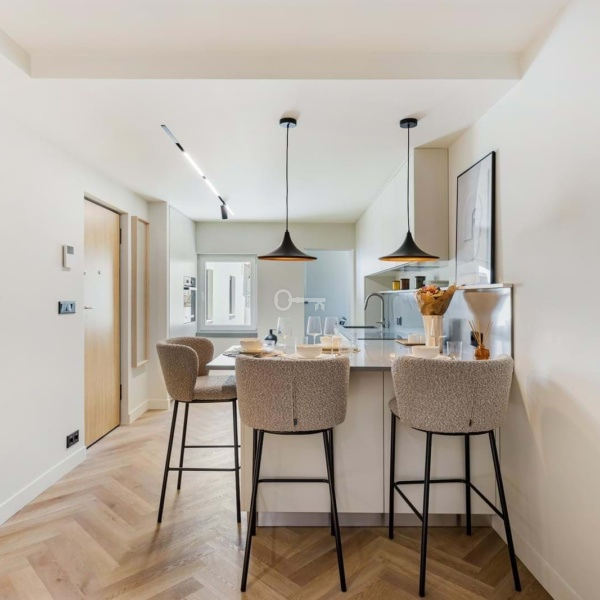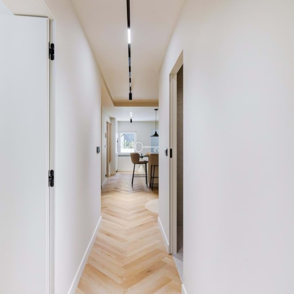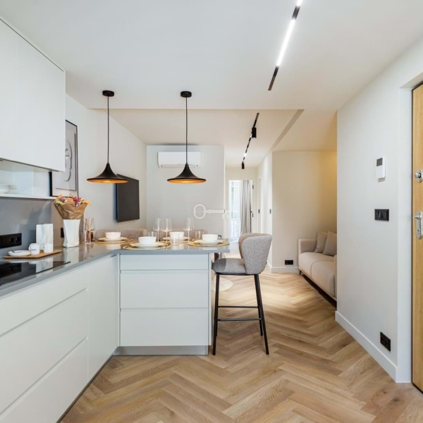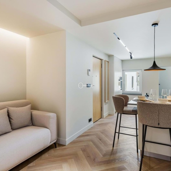 Apartament wyposażono w wysokiej jakości sprzęt i wykończenia, w tym urządzenia AGD firm Miele i AEG, klimatyzację DAIKIN, 100-litrowy elektryczny podgrzewacz wody Bosch, trzy poziomy oświetlenia, rozwierno-uchylne okna z podwójnymi szybami, pancerne drzwi wejściowe i wideodomofon. Meble zostały wykonane na zamówienie, a obie sypialnie mają przestronne wbudowane szafy z oświetleniem. Odnowiona została również elewacja budynku i części wspólne.