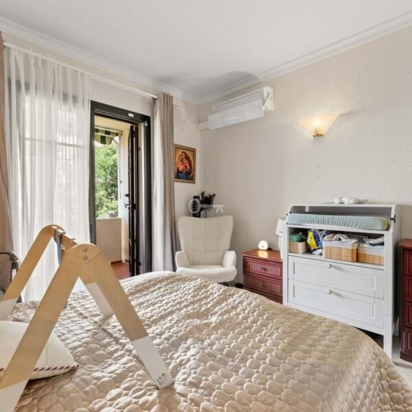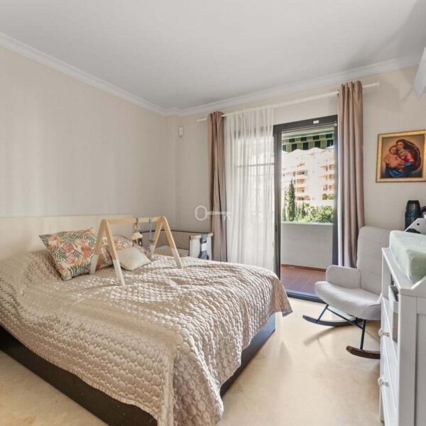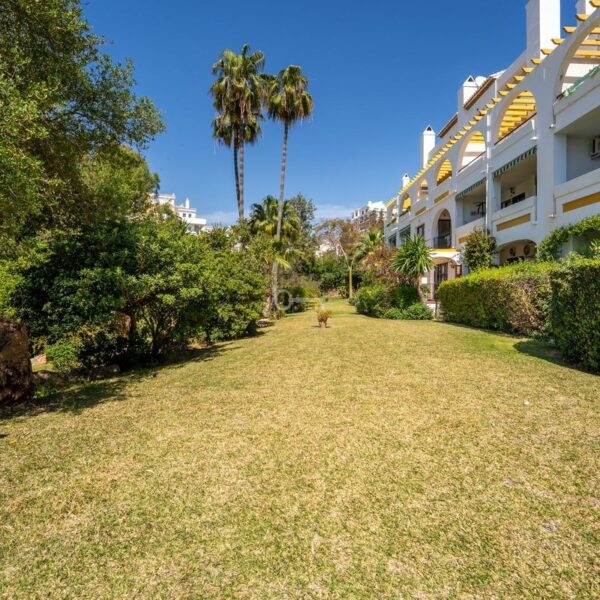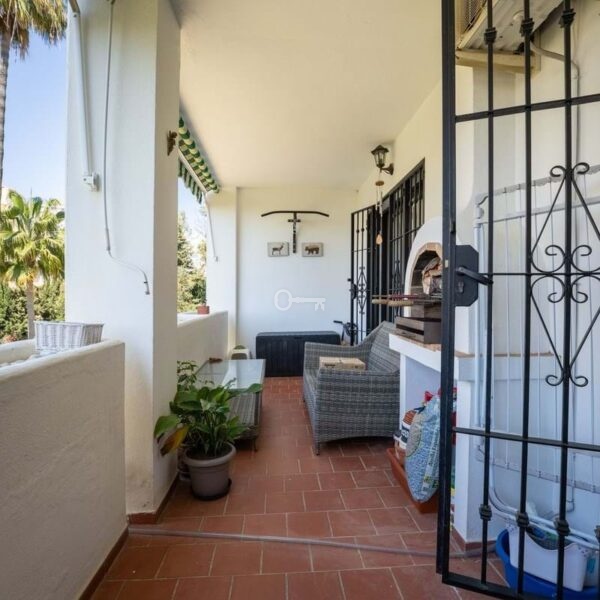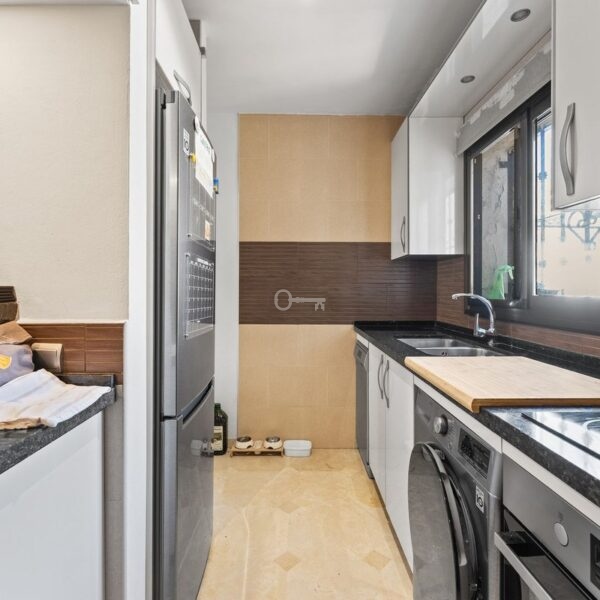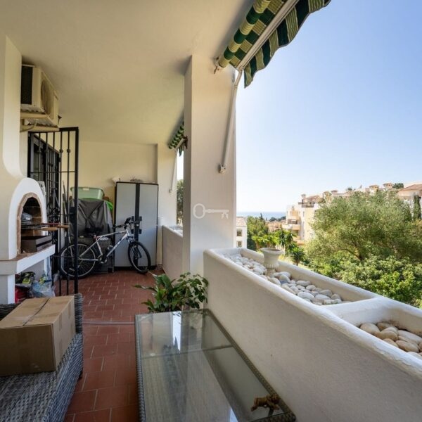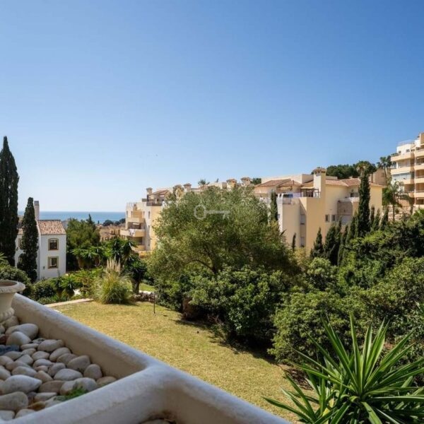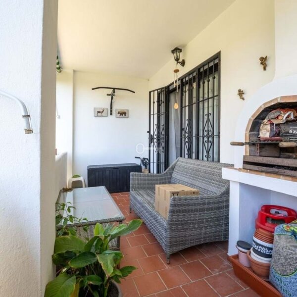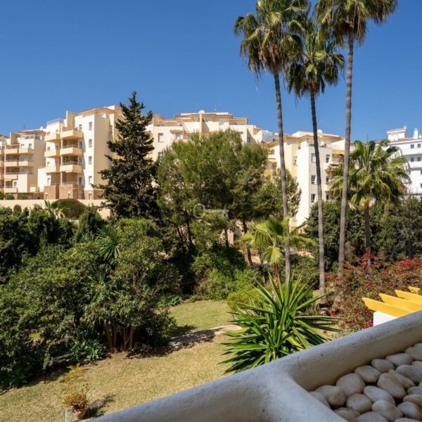 The kitchen has been renovated, and the marble floors add a sense of quality, freshness, and timeless elegance. From the covered southwest-facing terrace, you can enjoy plenty of natural light throughout the day, with open views mainly over the community gardens and a slight glimpse of the sea, adding even more charm to the property.