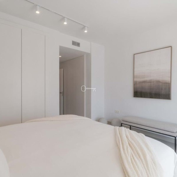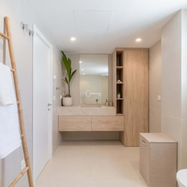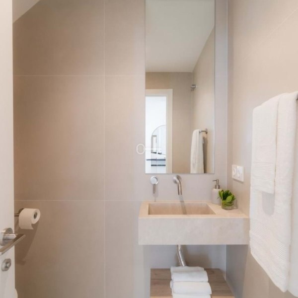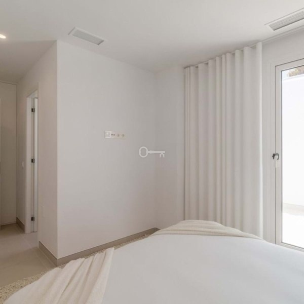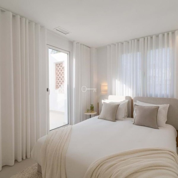 Urządzony w eleganckim skandynawskim stylu dom obejmuje jasną kuchnię na otwartym planie oraz przestronną część dzienną z uroczym sklepionym sufitem. Szklane drzwi otwierają się na prywatny taras ze stołem na świeżym powietrzu, idealny do cieszenia się śródziemnomorskim stylem życia.