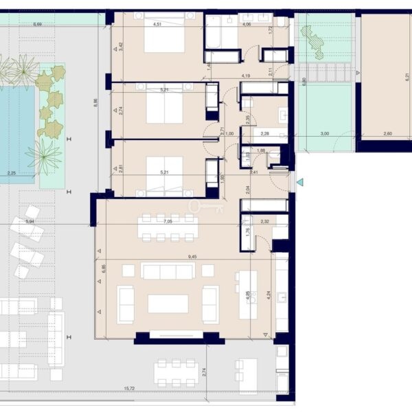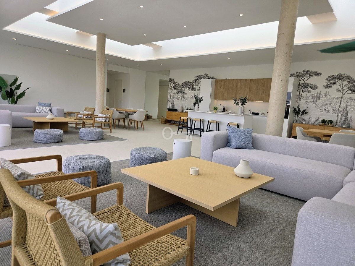 Salon jest w pełni umeblowany wysokiej klasy designerskimi meblami, tworząc wyrafinowaną, ale komfortową atmosferę z bezpośrednim dostępem do tarasu i prywatnego basenu.