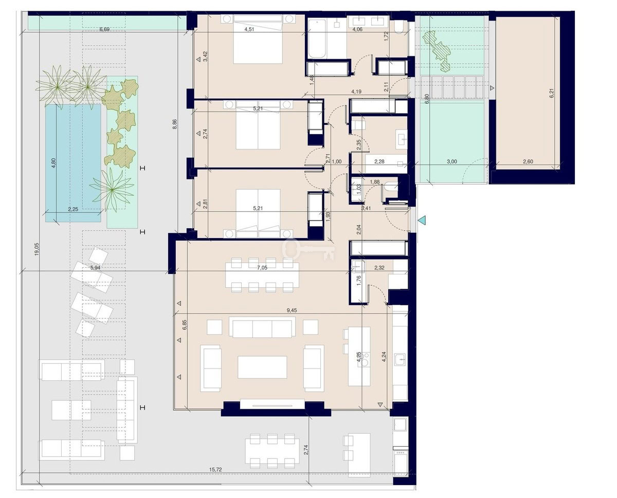 Przestronny apartament z prywatnym basenem i dużym zadaszonym tarasem, położony w jednej z najbardziej pożądanych dzielnic mieszkaniowych Marbelli, w otoczeniu pól golfowych i blisko morza.