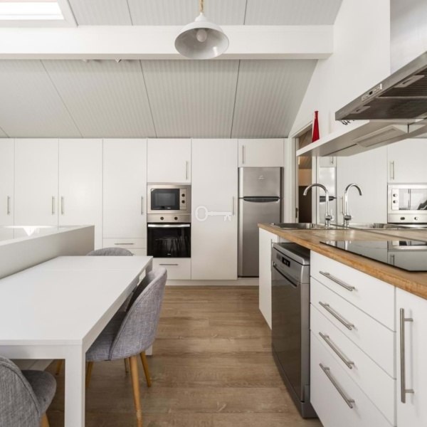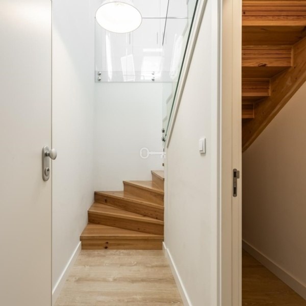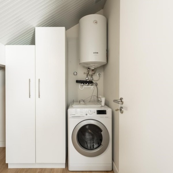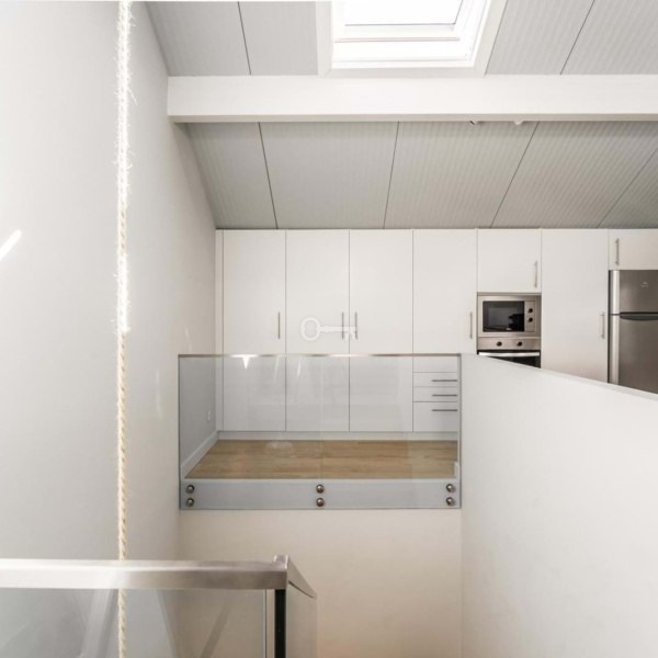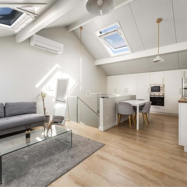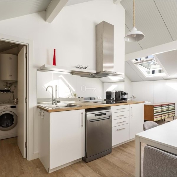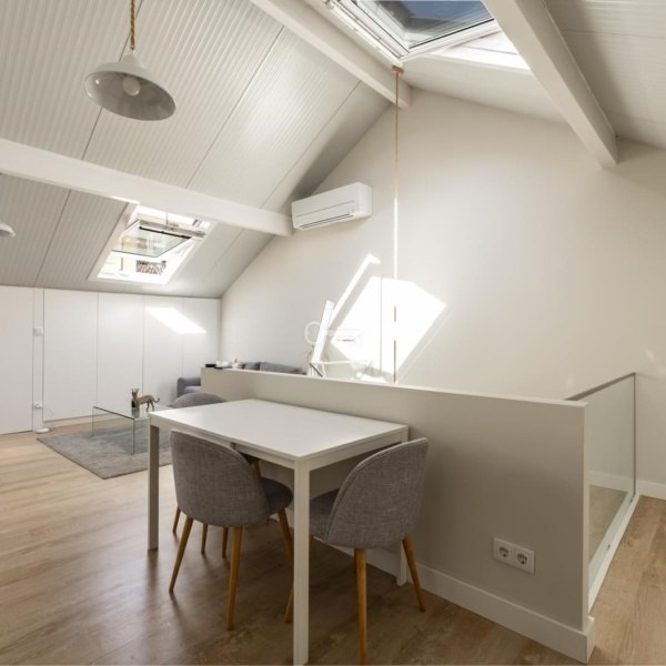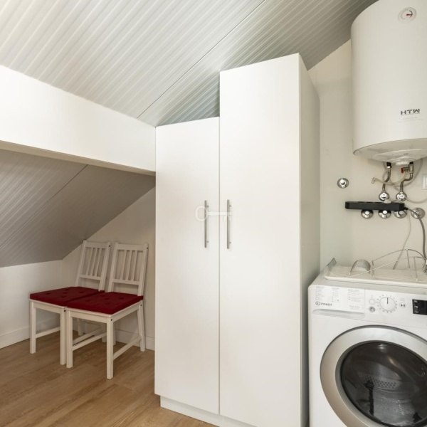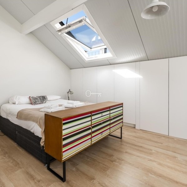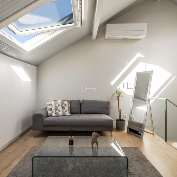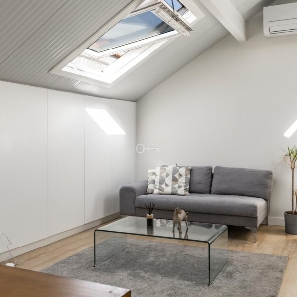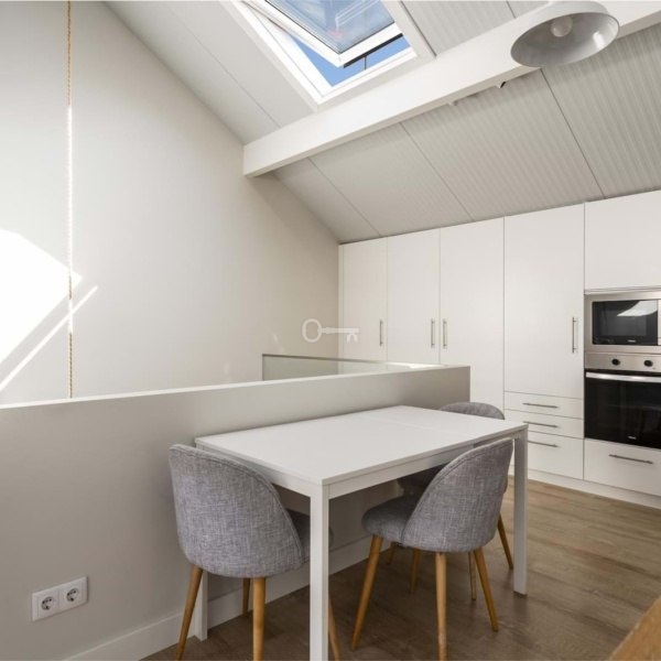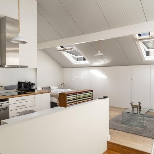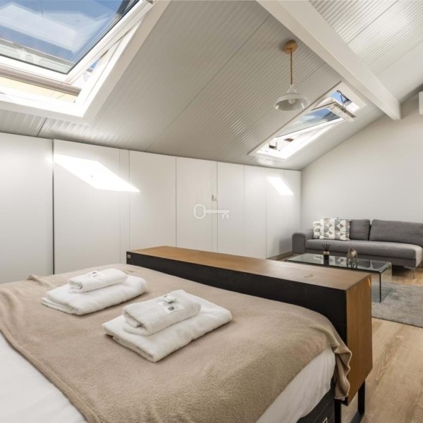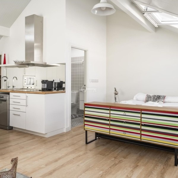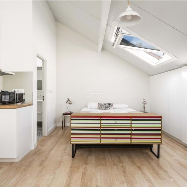 Studio na poddaszu małego budynku składającego się z 2 pięter. Jasne studio, z bardzo wysokim sufitem, nowoczesne i wygodne, z wyposażoną kuchnią, pływającą podłogą, wbudowanymi szafami, klimatyzacją, podwójnymi szybami w oknach typu velux i wbudowanym oświetleniem. Łazienka jest duża i bardzo jasna. Mieszkanie ma prywatne wewnętrzne schody i dwa schowki, które są dość przestronne.