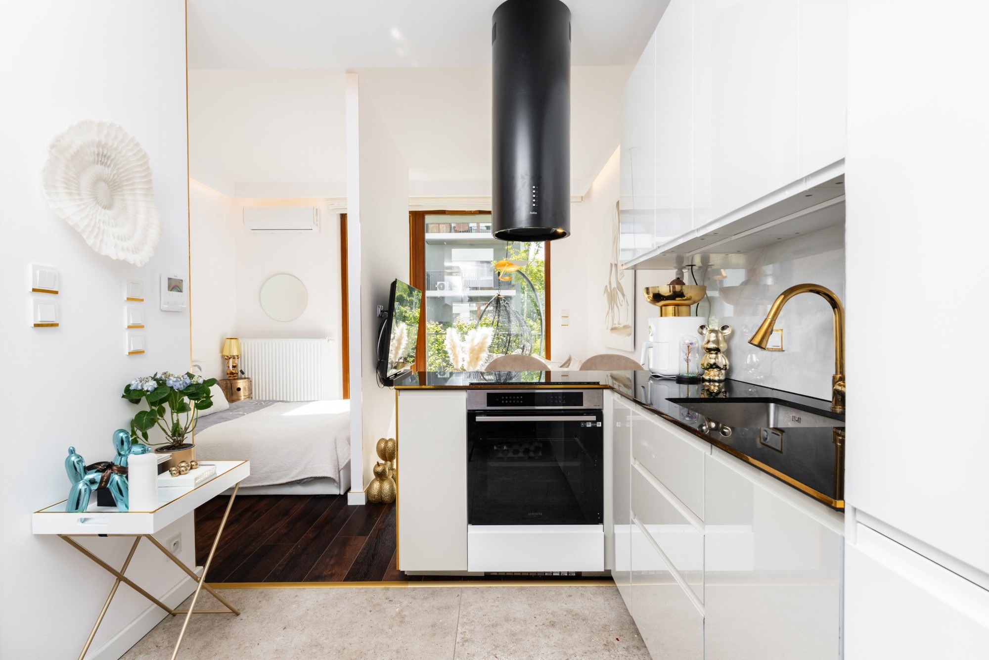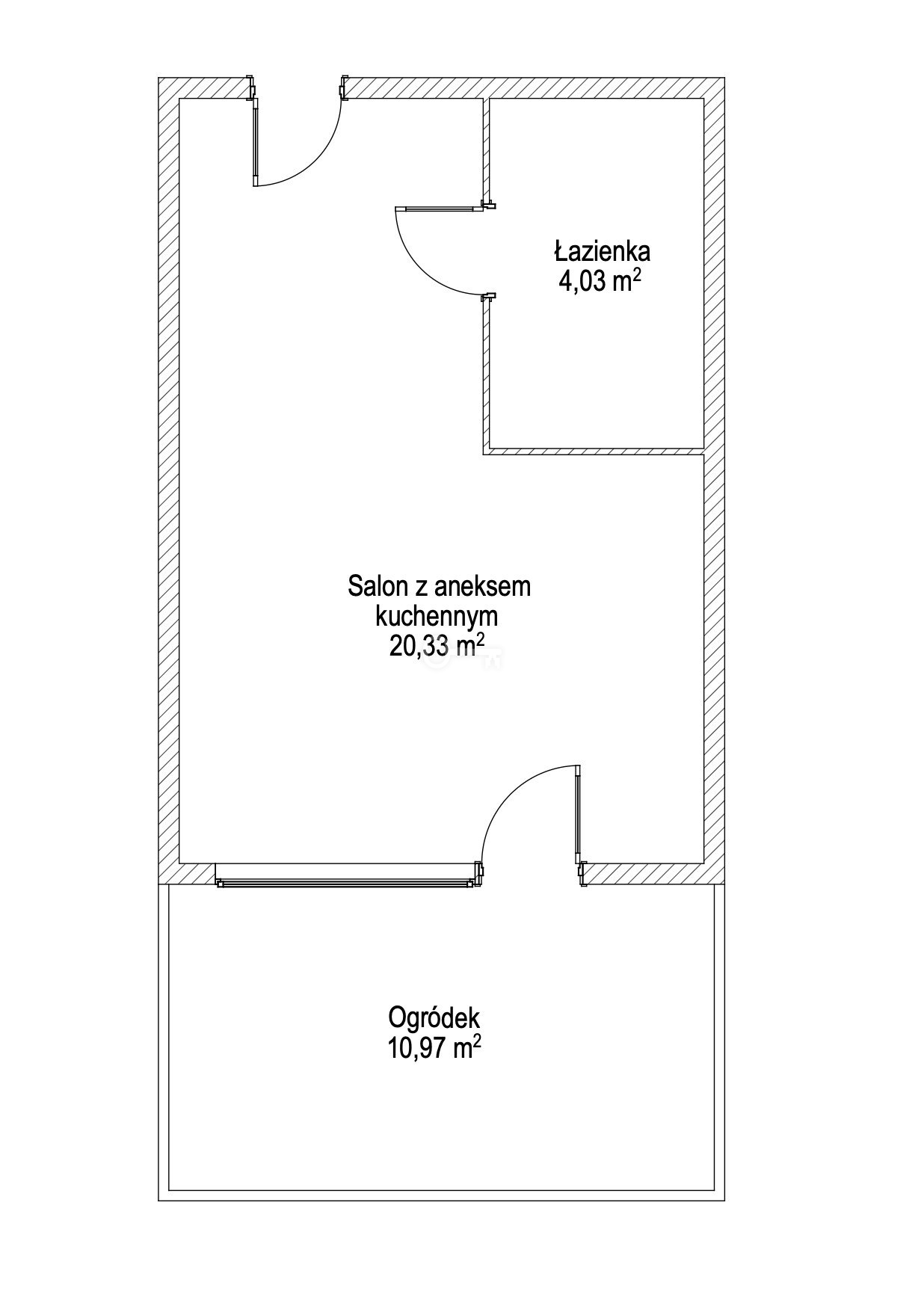 Kawalerka z praktycznym układem, w którym część sypialniana została oddzielona ścianką (możliwość usunięcia)