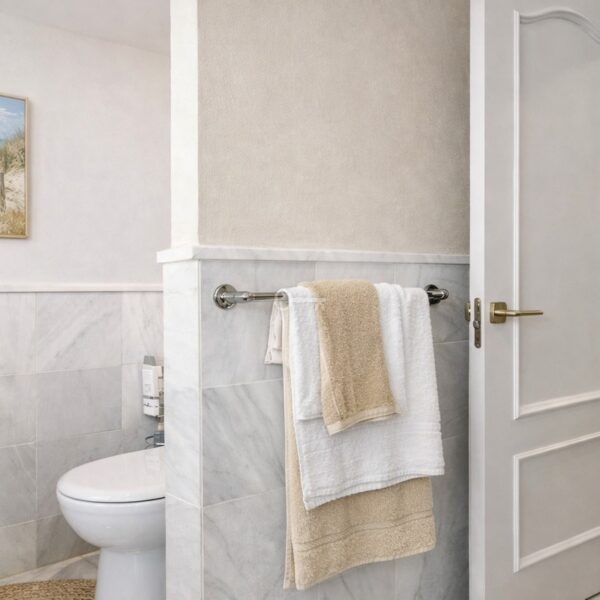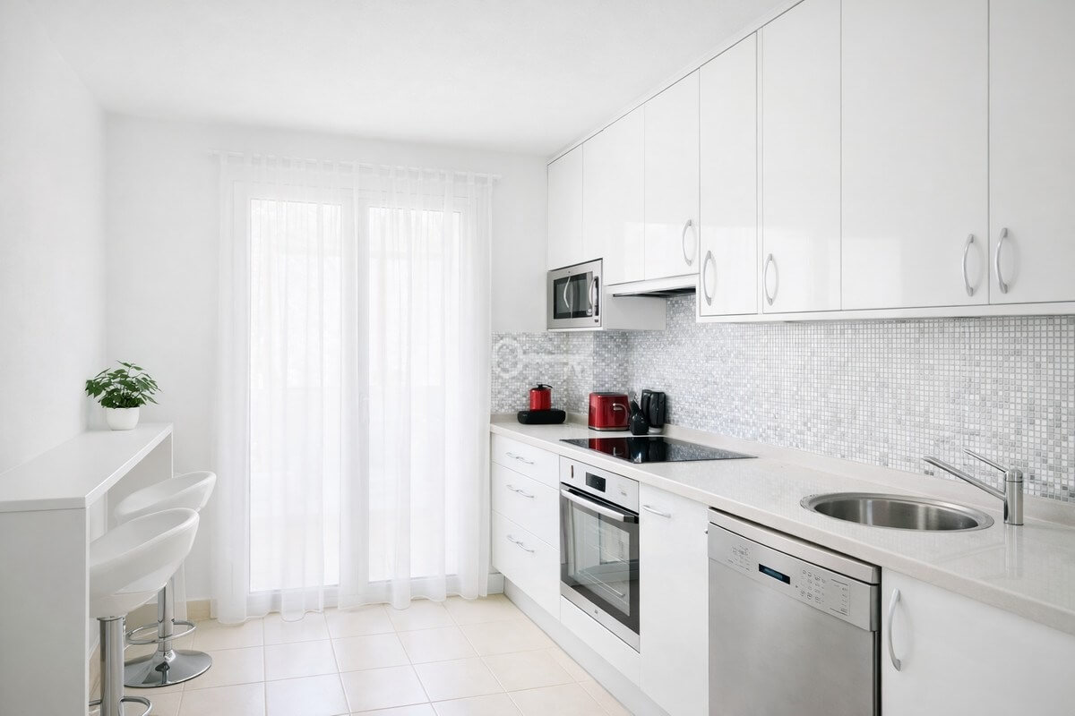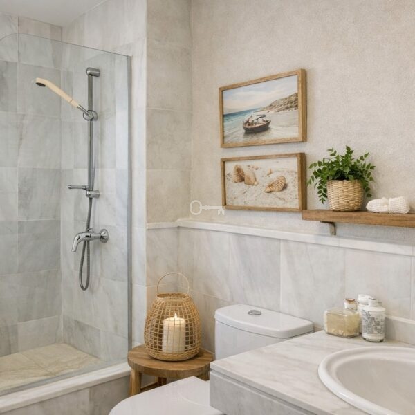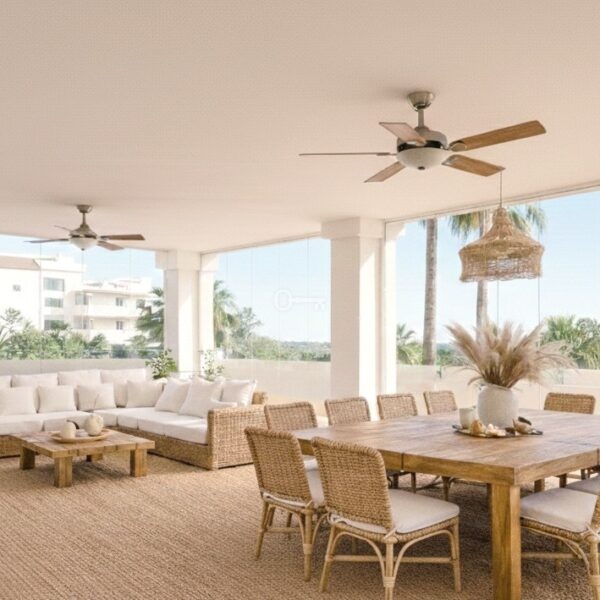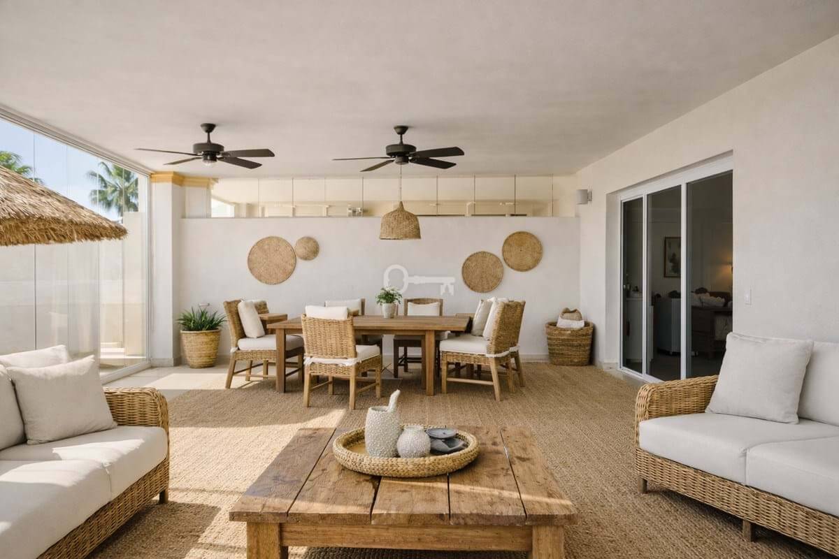 The property stands out for its generous 74 m² of terraces, a key feature for buyers searching for a ground floor apartment with large terrace in Estepona. The main covered terrace includes a Lumon-style glass curtain system, allowing year-round use as an extended living room in winter and a fully open outdoor space in summer. The expansive open terrace offers a private Jacuzzi, creating a true Costa del Sol outdoor lifestyle experience with direct access to communal gardens and a year-round swimming pool.