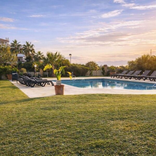 Situated in Estepona East, one of the most desirable residential areas on the Costa del Sol, the property is just a five-minute walk to the beach, beach bars and restaurants. It is adjacent to La Resina Golf & Country Club and close to Selwo Aventura, making it particularly attractive for golf property buyers in Estepona. Hospiten Hospital is less than 1 km away. Estepona centre is 58 minutes by car, Puerto Banús and Marbella are 1520 minutes away, and Málaga International Airport can be reached in approximately 45 minutes via the AP-7.