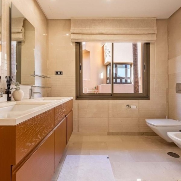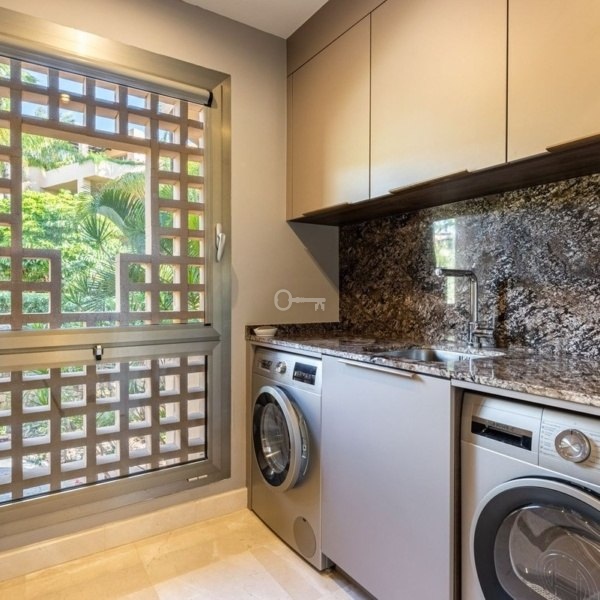 Ten przestronny i pięknie zmodernizowany apartament posiada zupełnie nową kuchnię, niestandardowe szafy i wysokiej klasy system klimatyzacji. Układ obejmuje powitalny korytarz, duży salon i jadalnię na otwartym planie, w pełni wyposażoną kuchnię, główną sypialnię z łazienką oraz sypialnię dla gości z prywatnym tarasem i własną przestronną łazienką. Główną atrakcją domu jest rozległy taras o powierzchni 41 m² od strony południowej, przeszklony, aby cieszyć się nim przez cały rok. Dodatkowe luksusowe funkcje obejmują ogrzewanie podłogowe w całym mieszkaniu.