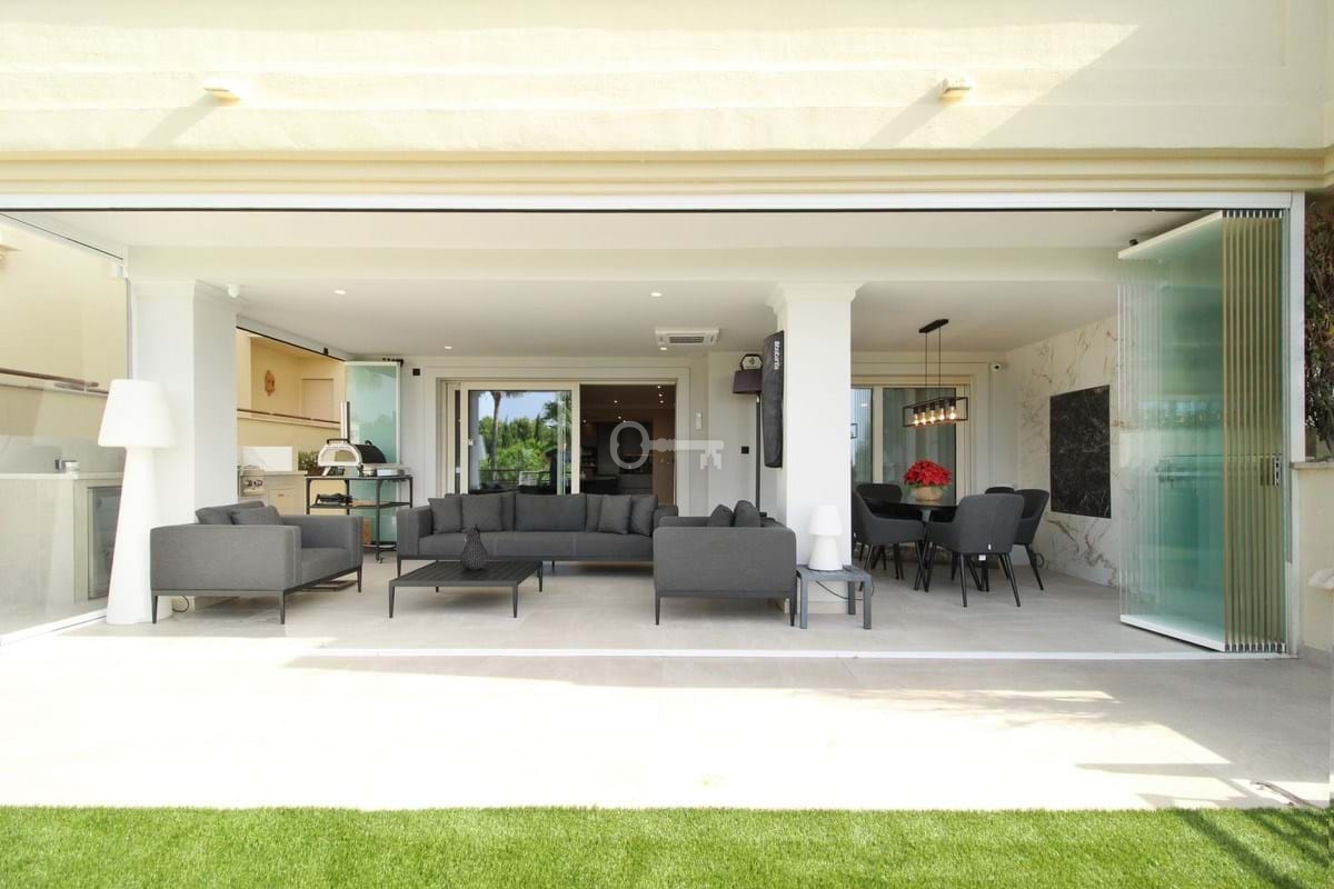 Kuchnia na otwartym planie, wyposażona w urządzenia Siemens, również łączy się bezpośrednio z tarasem, na którym znajduje się w pełni wyposażona kuchnia na świeżym powietrzu i miejsce do grillowania. Obszerny salon i jadalnia otwierają się na wspaniały zadaszony taras z częścią wypoczynkową i jadalną. Zainstalowano szklane zasłony, umożliwiające całoroczne korzystanie z tego obszaru zewnętrznego, który korzysta również z własnego systemu klimatyzacji.