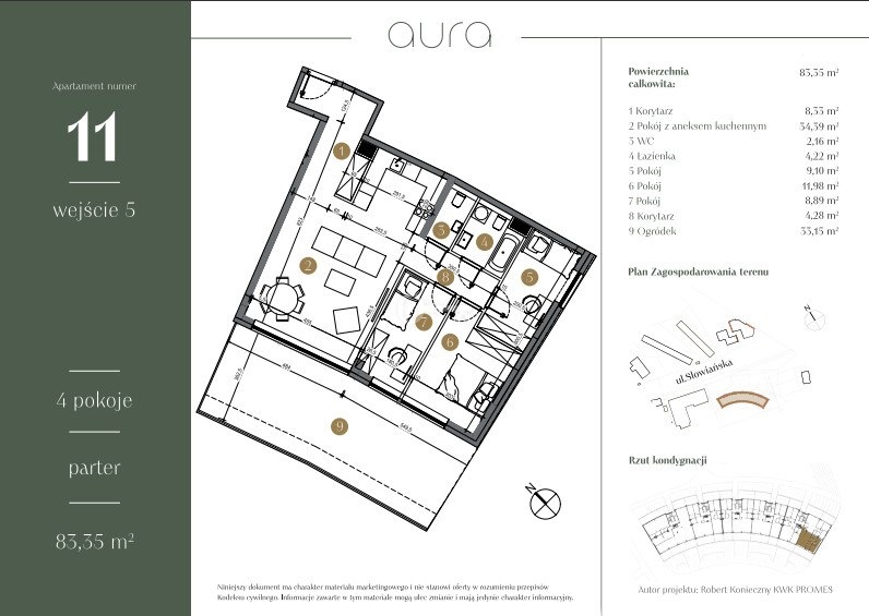Prezentujemy Apartament nr 11 w prestiżowej inwestycji Aura przy ul. Słowiańskiej w Poznaniu – projekcie autorstwa Roberta Koniecznego (KWK Promes). To wyjątkowe mieszkanie o powierzchni 76,29 m², zlokalizowane na parterze, łączy komfort, nowoczesny design i kontakt z naturą. Dzięki przemyślanemu układowi, dużym przeszkleniom i tarasie wychodzącym na południowy zachód apartament jest pełen naturalnego światła i zapewnia wypoczynek z widokiem na niezakłóconą zieleń.