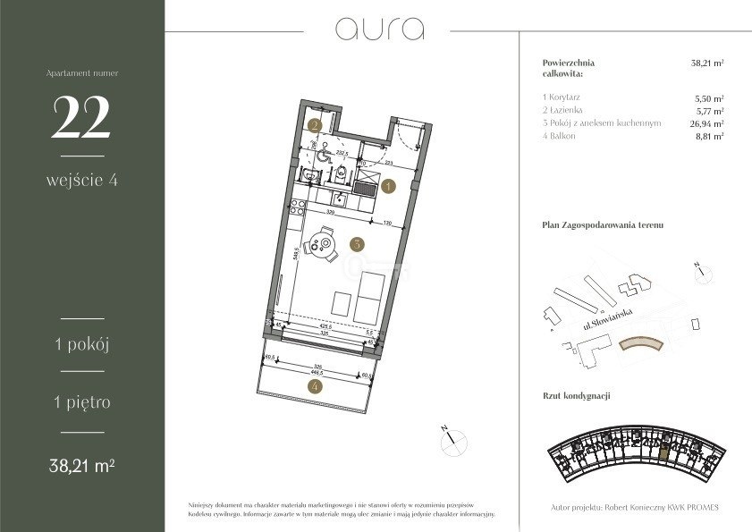Przedstawiamy Apartament nr 22 w prestiżowej inwestycji Aura przy ul. Słowiańskiej w Poznaniu – projekcie autorstwa Roberta Koniecznego (KWK Promes). To unikalne połączenie najwyższej klasy architektury, sztuki i ekologii. 1‑pokojowy apartament